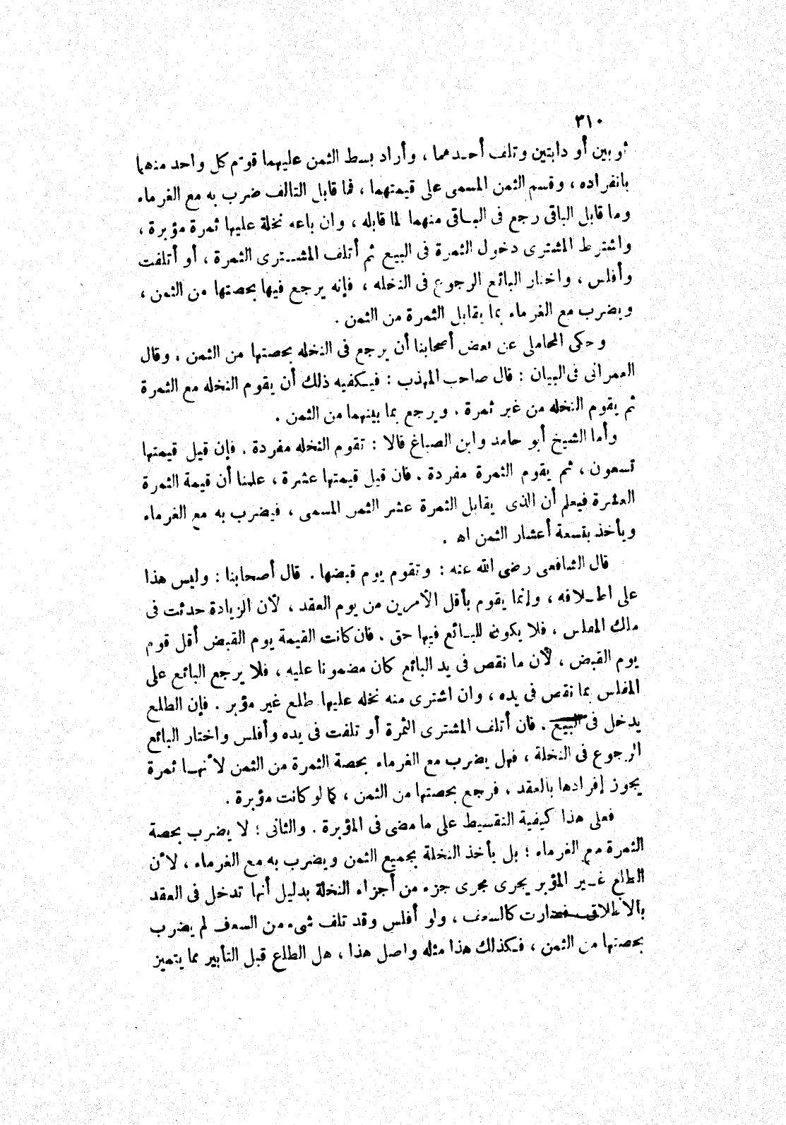 ثوبين أو دابتين وتلف أحدهما، وأراد بسط الثمن عليهما قوم كل واحد منهما بانفراده، وقسم الثمن المسمى على قيمتهما، فما قابل التالف ضرب به مع الغرماء وما قابل الباقي رجع في الباقي منهما لما قابله، وان باعه نخلة عليها ثمرة مؤبرة، واشترط المشترى دخول الثمرة في البيع ثم أتلف المشترى الثمرة، أو أتلفت وأفلس، واختار البائع الرجوع في النخله، فإنه يرجع فيها بحصتها من الثمن، ويضرب مع الغرماء بما يقابل الثمرة من الثمن.