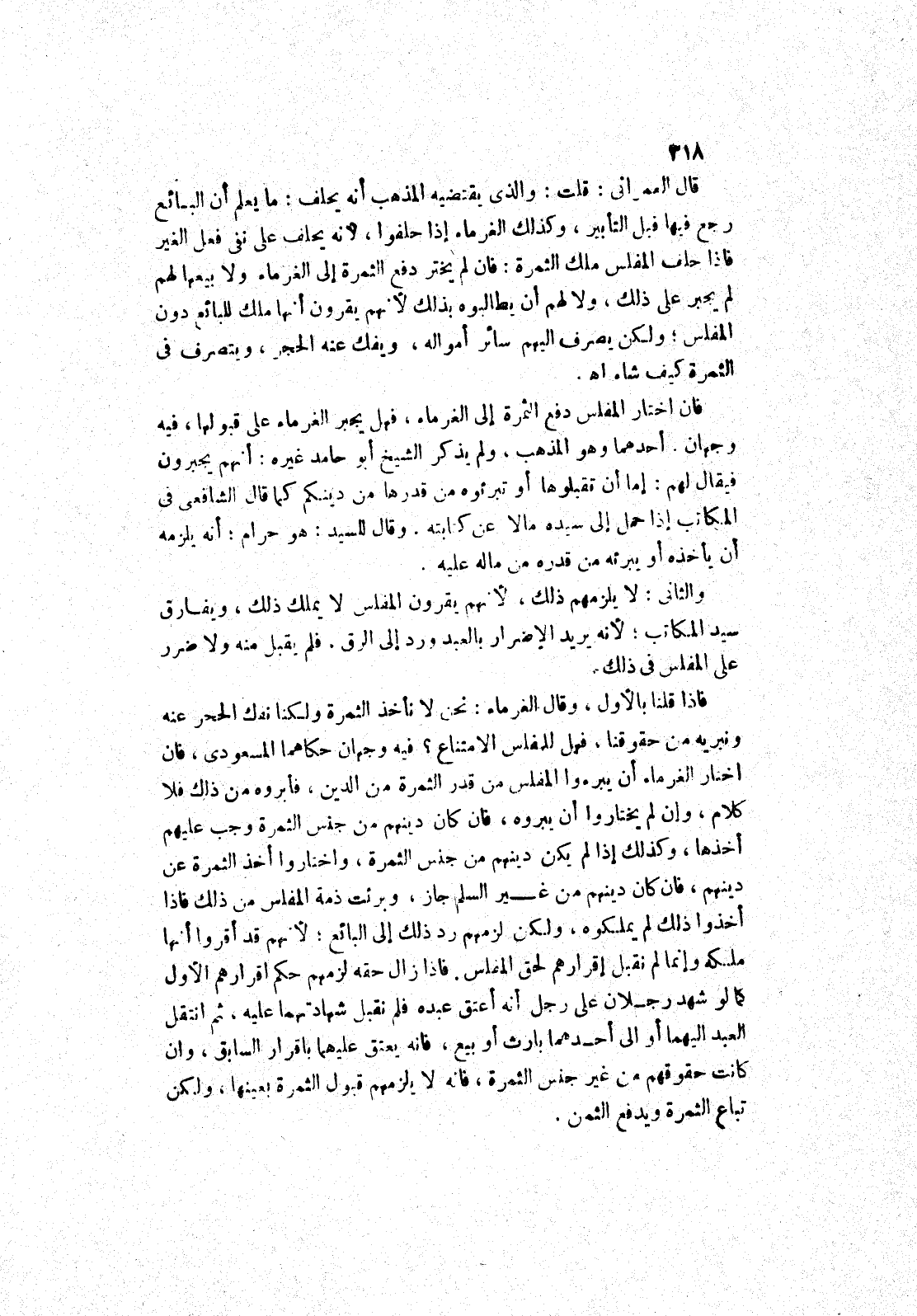 والثانى: لا يلزمهم ذلك، لانهم يقرون المفلس لا يملك ذلك، ويفارق سيد المكاتب، لانه يريد الاضطرار بالعبد ورد إلى الرق، فلم يقبل منه ولا ضرر على المفلس في ذلك فإذا قلنا بالاول، وقال الغرماء: نحن لا نأخذ الثمرة ولكنا نفك الحجر عنه ونبريه من حقوقنا، فهل للمفلس الامتناع؟ فيه وجهان حكاهما المسعودي، فان اختار الغرماء أن يبرء والمفلس من قدر الثمرة من الدين، فأبروه من ذلك فلا كلام، وإن لم يختاروا أن يبروه، فان كان دينهم من جنس الثمرة وجب عليهم أخذها، وكذلك إذا لم يكن دينهم من جنس الثمرة، واختاروا أخذ الثمرة عن دينهم، فان كان دينهم من غير السلم جاز، وبرئت ذمة المفلس من ذلك فإذا أخذوا ذلك لم يملكوه، ولكن لزمهم رد ذلك إلى البائع، لانهم قد أقروا أنها ملكه وإنما لم نقبل إقرارهم لحق المفلس.