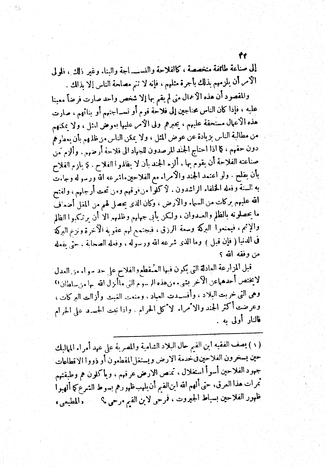 (1) يصف الفقيه ابن القيم حال البلاد الشامية والمصرية على عهد أمراء المماليك حين يسخرون الفلاحين في خدمة الارض ويستغل المقطعون أو ذووا الاقطاعات جهود الفلاحين أسوأ استغلال، تمنص الارض عرقهم، ويأكلون هم وطبقتهم ثمرات هذا العرق، حتى ألهم الله ابن القيم أن يلهب ظهورهم بسوط الشرع كما ألهبوا ظهور الفلاحين بسياط الجيروت، فمرحى لابن القيم مرحى؟ " المطيعى "