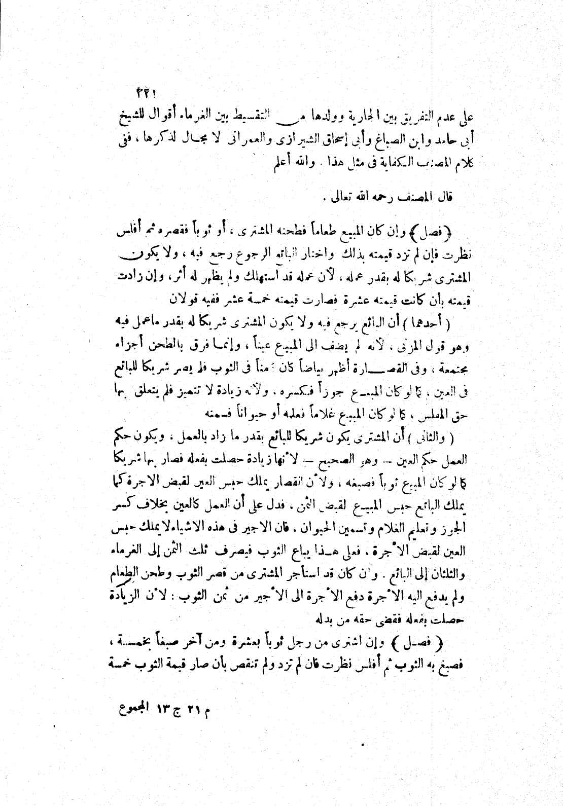 أن البائع يرجع فيه ولا يكون المشترى شريكا له بقدر ما عمل فيه وهو قول المزني، لانه لم يضف إلى المبيع عينا، وإنما فرق بالطحن أجزاء مجتمعة، وفى القصارة أظهر بياضا كان؟ منا في الثوب فلم يصر شريكا للبائع في العين، كما لو كان المبيع جوزا فكسره، ولانه زيادة لا تتميز فلم يتعلق بها