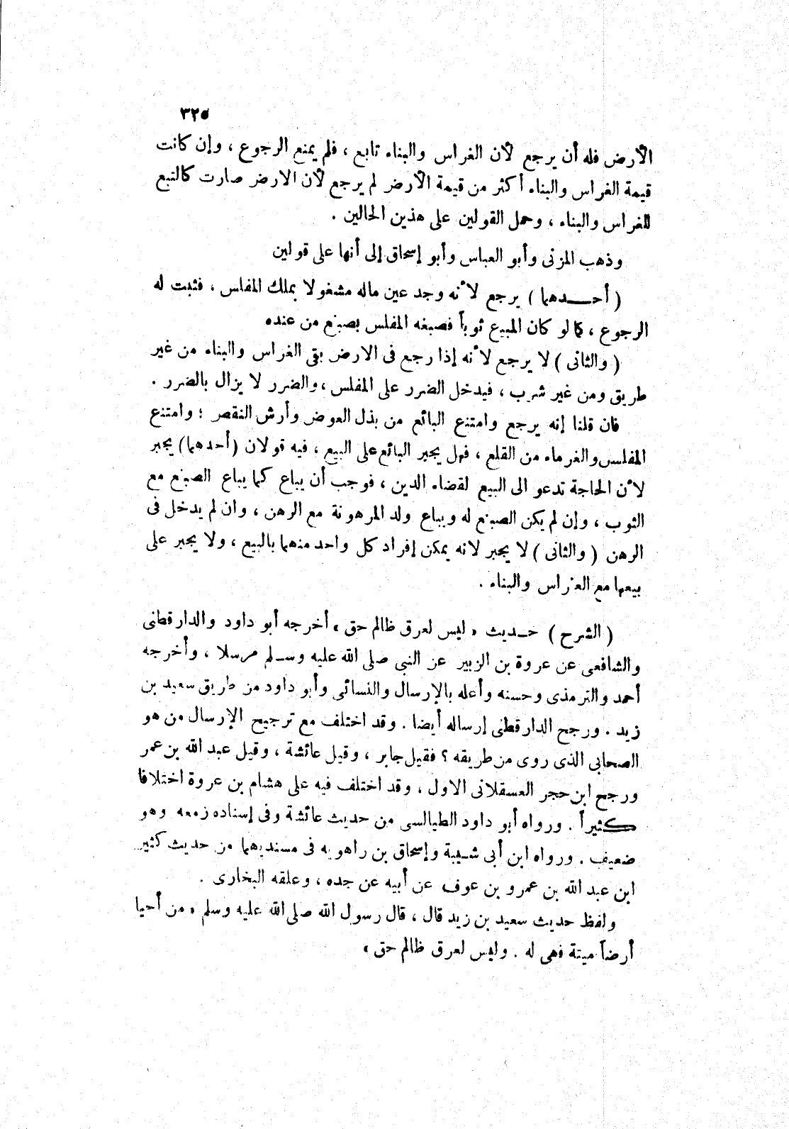 (الشرح) حديث " ليس لعرق ظالم حق " أخرجه أبو داود والدارقطني والشافعي عن عروة بن الزبير عَنْ النَّبِيِّ صَلَّى اللَّهُ عَلَيْهِ وَسَلَّمَ مُرْسَلًا، وأخرجه أحمد والترمذي وحسنه وأعله بالارسال والنسائي وأبو داود من طريق سعيد بن زيد.
