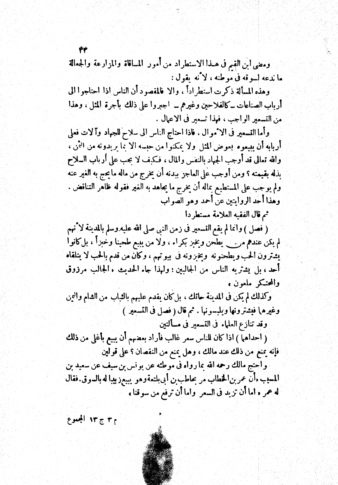 ومضى ابن القيم في هذا الاستطراد من أمور المساقاة والمزارعة والجعالة ما ندعه لسوقه في موطنه، لانه يقول: وهذه المسألة ذكرت استطرادا، والا فالمقصود أن الناس إذا احتاجوا إلى أرباب الصناعات - كالفلاحين وغيرهم - اجبروا على ذلك بأجرة المثل، وهذا من التسعير الواجب، فهذا تسعير في الاعمال.