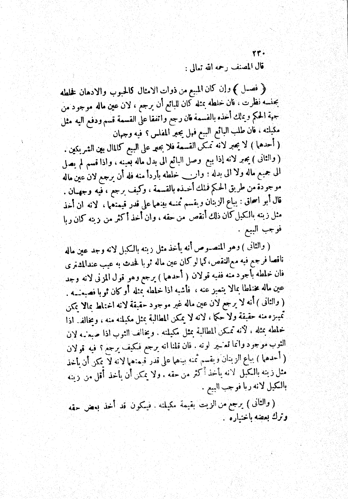 وإن كان المبيع من ذوات الامثال كالحبوب والادهان فخلطه بجنسه نظرت، فان خلطه بمثله كان للبائع أن يرجع، لان عين ماله موجود من جهة الحكم ويملك أخذه بالقسمة فان رجع واتفقا على القسمة قسم ودفع إليه مثل مكيلته، فان طلب البائع البيع فهل يجبر المفلس؟ فيه وجهان
