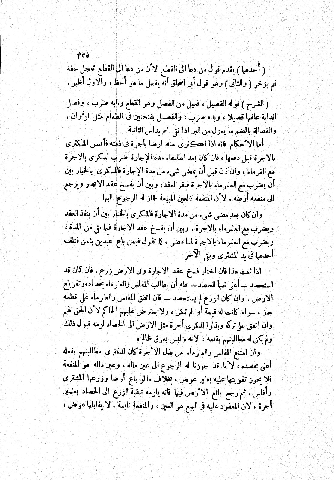 (الشرح) قوله القصيل، فعيل من القصل وبابه ضرب، وقصل الدابة علفها قصيلا، وبابه ضرب، والقصل بفتحتين في الطعام مثل الزوان، والقصالة بالضم ما يعزل من البر إذا نقى ثم يداس الثانية أما الاحكام فانه إذا اكترى منه ارضا بأجرة في ذمته فأفلس المكترى بالاجرة قبل دفعها، فان كان بعد استيفاء مدة الاجارة ضرب المكرى بالاجرة مع الغرماء، وان كان قبل أن يمضى شئ من مدة الاجارة فالمكرى بالخيار بين أن يضرب مع الغرماء بالاجرة فيقر العقد، وبين أن يفسخ عقد الايجار ويرجع إلى منفعة أرضه، لان المنفعة كالعين المبيعة فجاز له الرجوع إليها وان كان بعد مضى شئ من مدة الاجارة فالمكرى بالخيار بين أن ينفذ العقد ويضرب مع الغرماء بالاجرة، وبين أن يفسخ عقد الاجارة فيما بقى من المدة، ويضرب مع الغرماء بالاجرة لما مضى، كما تقول فيمن باع عبدين بثمن فتلف أحدهما في يد المشترى وبقى الآخر إذا ثبت هذا فان اختار فسخ عقد الاجارة وفى الارض زرع، فان كان قد استحصد - أعنى تهيأ للحصد - فله أن يطالب المفلس والغرماء بحصاده وتفريغ الارض، وان كان الزرع لم يستحصد - فان اتفق المفلس والغرماء على قطعه جاز، سواء كانت قيمة أو لم تكن، ولا يعترض عليهم الحاكم لان الحق لهم وان اتفق على تركه وبذلوا للمكرى أجرة مثل الارض إلى الحصاد لزمه قبول ذلك ولم يكن له مطالبتهم بقلعه، لانه " ليس بعرق ظالم " وان امتنع المفلس والغرماء من بذل الاجرة كان للمكترى مطالبتهم بفعله أعنى بحصده، لانا قد جوزنا له الرجوع إلى عين ماله، وعين ماله هو المنفعة فلا يجوز تفويتها عليه بغير عوض، بخلاف ما لو باع أرضا وزرعها المشترى وأفلس، ثم رجع بائع الارض فيها فانه يلزمه تبقية الزرع إلى الحصاد بغير
