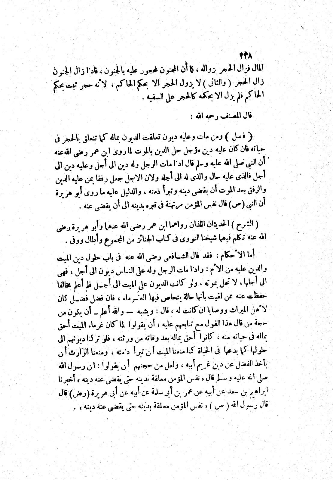 ومن مات وعليه ديون تعلقت الديون بماله كما تتعلق بالحجر في حياته فان كان عليه دين مؤجل حل الدين بالموت لما روى ابْنِ عُمَرُ رَضِيَ اللَّهُ عَنْهُ أَنَّ النَّبِيَّ صَلَّى اللَّهُ عَلَيْهِ وَسَلَّمَ قَالَ إذَا مَاتَ الرجل وله دين إلى أجل وعليه دين إلى أجل فالذي عليه حال والذى له إلى أجله ولان الاجل جعل رفقا بمن عليه الدين والرفق بعد الموت أن يقضى دينه وتبرأ ذمته، والدليل عليه ما رَوَى أَبُو هُرَيْرَةَ أَنَّ النَّبِيَّ صَلَّى اللَّهُ عَلَيْهِ وَسَلَّمَ قال نفس المؤمن مرتهنة في قبره بدينه إلى أن يقضى عنه.
