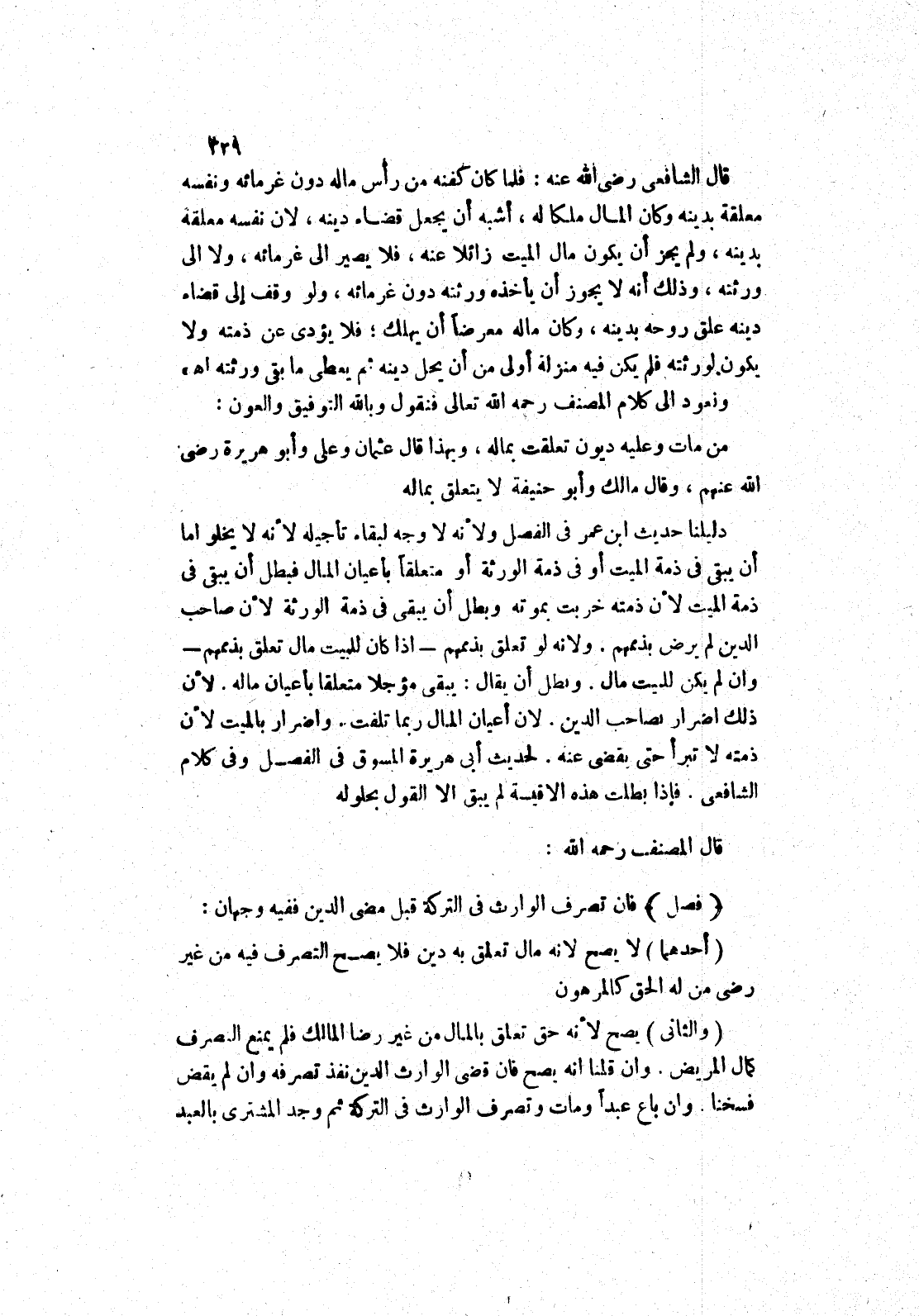 قال الشافعي رضى الله عنه: فلما كان كفنه من رأس ماله دون غرمائه ونفسه معلقة بدينه وكان المال ملكا له، أشبه أن يجعل قضاء دينه، لان نفسه معلقة بدينه، ولم يجز أن يكون مال الميت زائلا عنه، فلا يصير إلى غرمائه، ولا إلى ورثته، وذلك أنه لا يجوز أن يأخذه ورثته دون غرمائه، ولو وقف إلى قضاء دينه علق روحه بدينه، وكان ماله معرضا أن يهلك، فلا يؤدى عن ذمته ولا يكون لورثته فلم يكن فيه منزلة أولى من أن يحل دينه ثم يعطى ما بقى ورثته اه " ونعود إلى كلام المصنف رحمه الله تعالى فنقول وبالله التوفيق والعون: من مات وعليه ديون تعلقت بماله، وبهذا قال عثمان وعلى وأبو هريرة رضى الله عنهم، وقال مالك وأبو حنيفة لا يتعلق بماله دليلنا حديث ابن عمر في الفصل ولانه لا وجه لبقاء تأجيله لانه لا يخلو اما