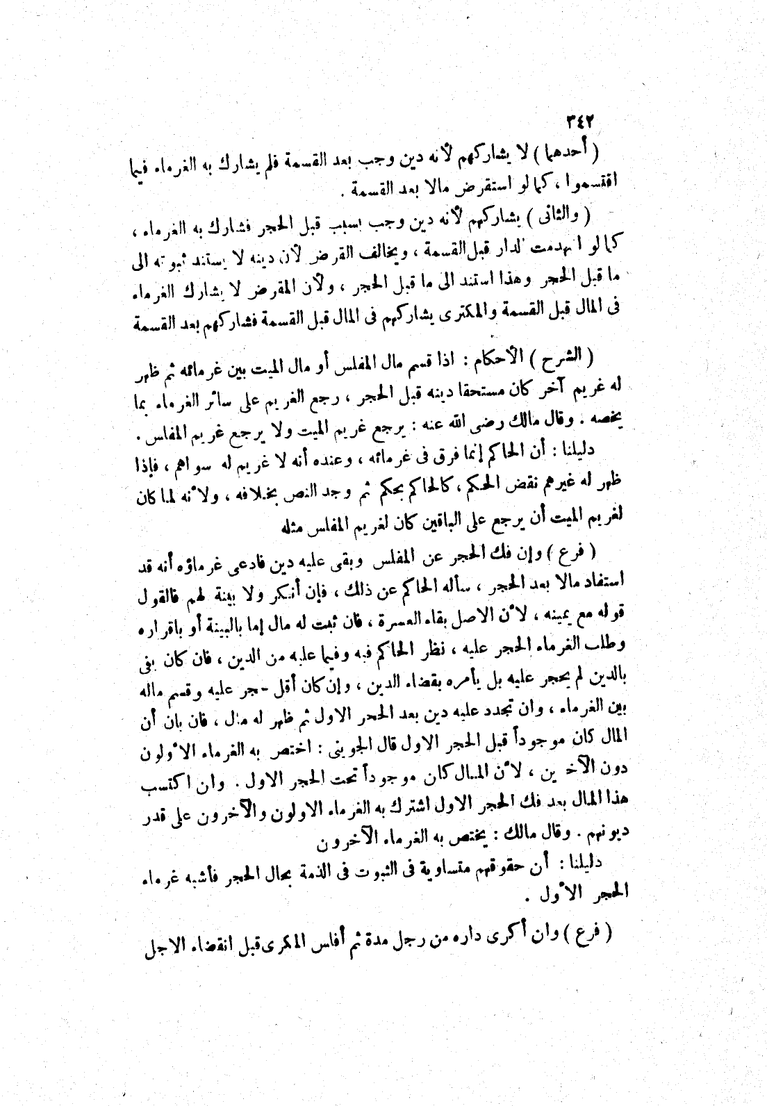 يشاركهم لانه دين وجب بسبب قبل الحجر فشارك به الغرماء، كما لو انهدمت الدار قبل القسمة، ويخالف القرض لان دينه لا يستند ثبوته إلى ما قبل الحجر وهذا استند إلى ما قبل الحجر، ولان المقرض لا يشارك الغرماء في المال قبل القسمة والمكترى يشاركهم في المال قبل القسمة فشاركهم بعد القسمة (الشرح) الاحكام: إذا قسم مال المفلس أو مال الميت بين غرمائه ثم ظهر له غريم آخر كان مستحقا دينه قبل الحجر، رجع الغريم على سائر الغرماء بما يخصه.