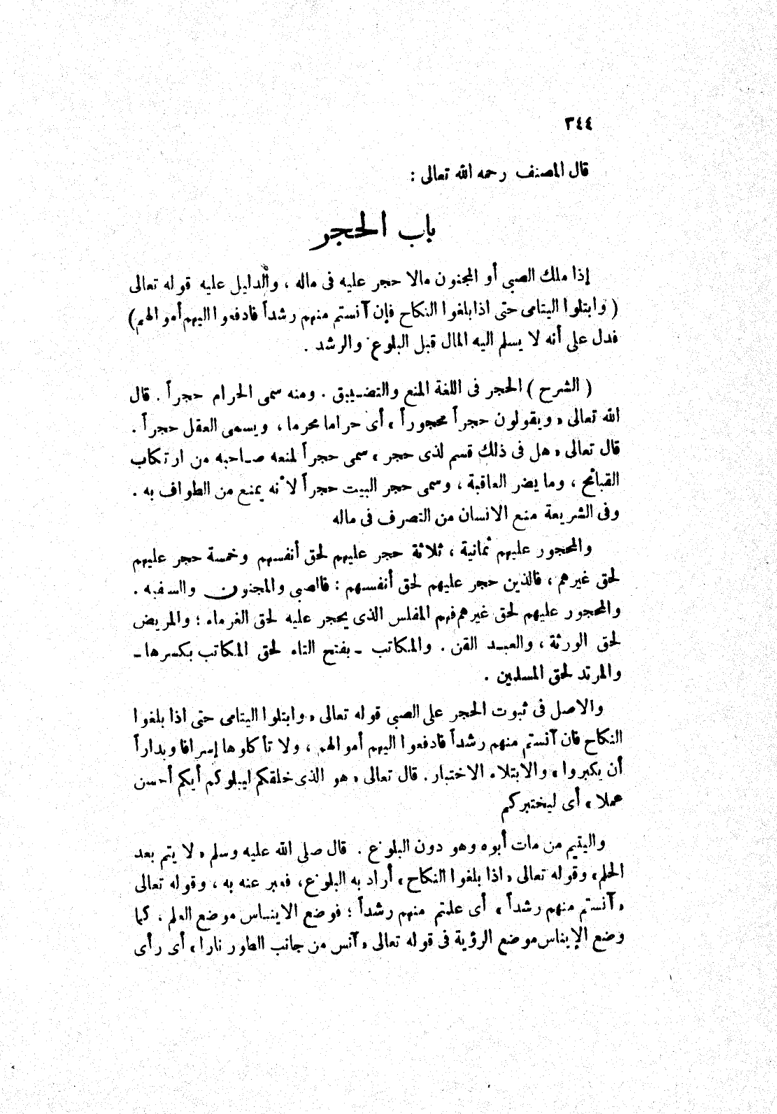 والاصل في ثبوت الحجر على الصبى قَوْله تَعَالَى " وَابْتَلُوا الْيَتَامَى حَتَّى إِذَا بَلَغُوا النِّكَاحَ فَإِنْ آنَسْتُمْ مِنْهُمْ رُشْدًا فَادْفَعُوا إِلَيْهِمْ أَمْوَالَهُمْ، ولا تأكلوها إسرافا وبدارا أن يكبروا " والابتلاء الاختبار.