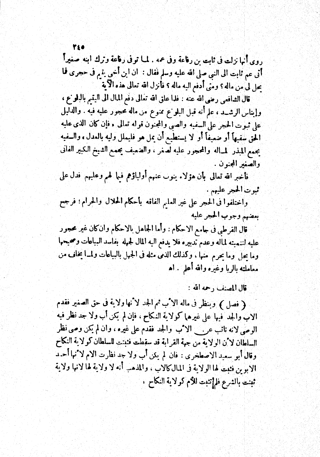 واختلفوا في الحجر على غير العليم الفاقه بأحكام الحلال والحرام، فرجح بعضهم وجوب الحجر عليه قال القرطبى في جامع الاحكام: وأما الجاهل بالاحكام وان كان غير محجور عليه لتنميته لماله وعدم تدبيره فلا يدفع إليه المال لجهله بفاسد البياعات وصحيحها وما يحل وما يحرم منها، وكذلك الذمي مثله في الجهل بالبياعات ولما يخاف من معاملته بالربا وغيره والله أعلم.