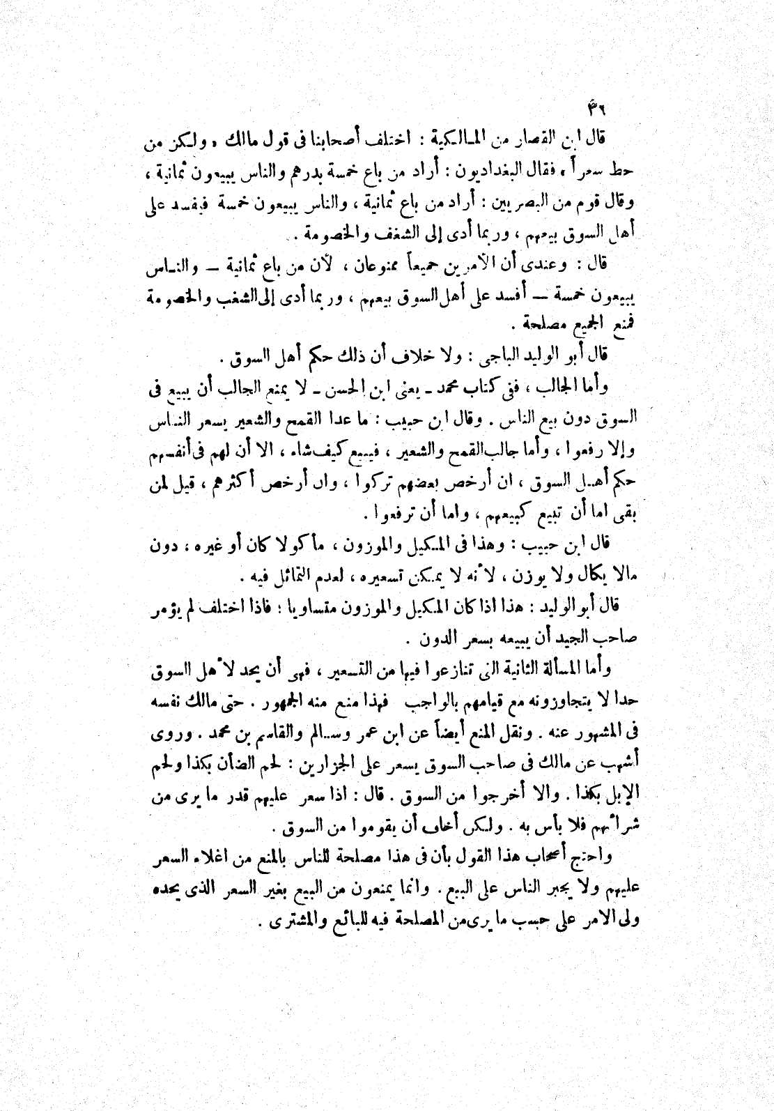 قال ابن حبيب: وهذا في المكيل والموزون، مأكولا كان أو غيره، دون مالا يكال ولا يوزن، لانه لا يمكن تسعيره، لعدم التماثل فيه.