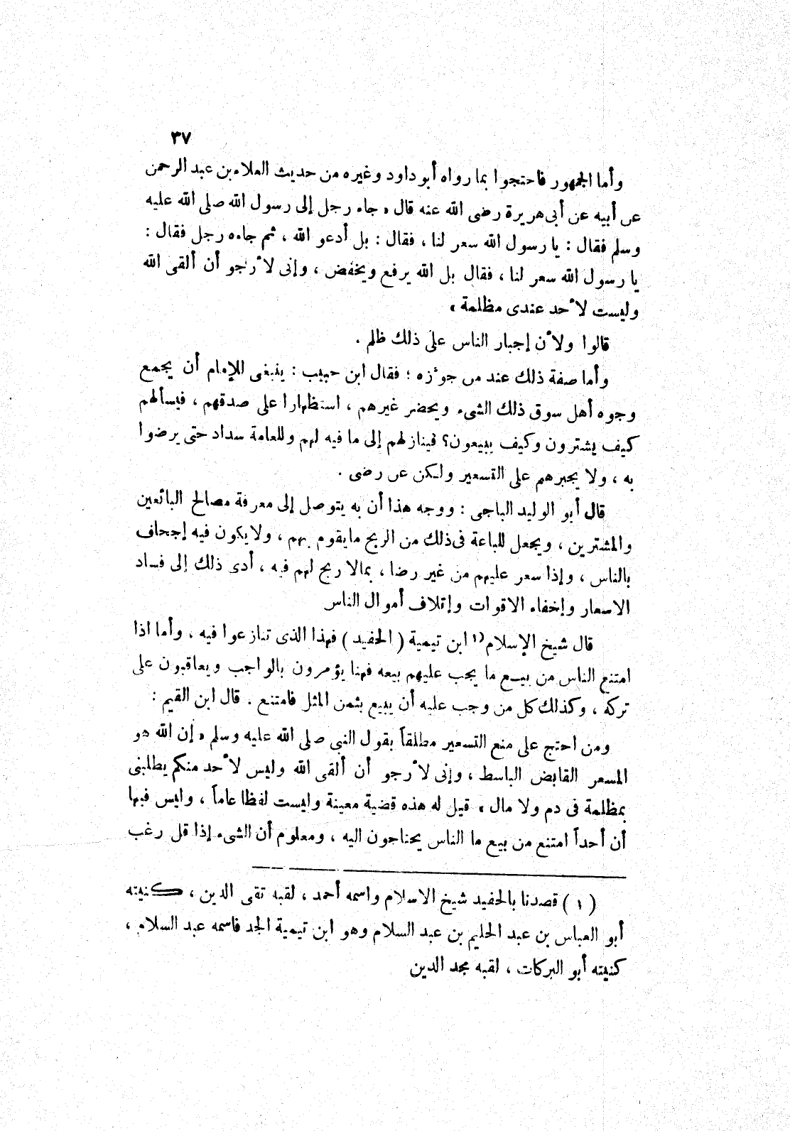 قال شيخ الاسلام (1) ابن تيمية (الحفيد) فهذا الذى تنازعوا فيه، وأما إذا امتنع الناس من بيع ما يجب عليهم بيعه فهنا يؤمرون بالواجب ويعاقبون على تركه، وكذلك كل من وجب عليه أن يبيع بثمن المثل فامتنع.