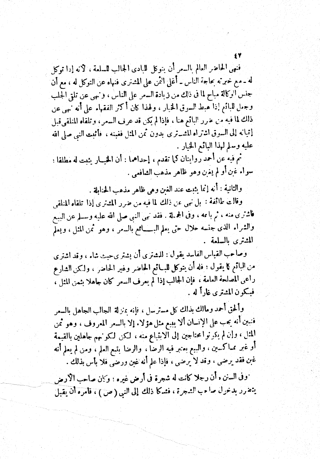 وصاحب القياس الفاسد يقول: للمشترى أن يشترى حيث شاء، وقد اشترى من البائع كما يقول، فله أن يتوكل للبائع الحاضر وغير الحاضر، ولكن الشارع راعى المصلحة العامة، فإن الجالب إذا لم يعرف السعر كان جاهلا بثمن المثل، فيكون المشترى غارا له.
