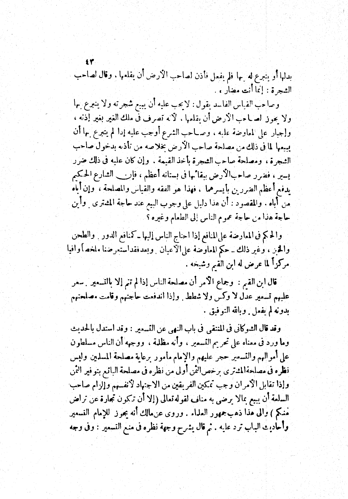 قال ابن القيم: وجماع الامر أن مصلحة الناس إذا لم تتم إلا بالتسعير.