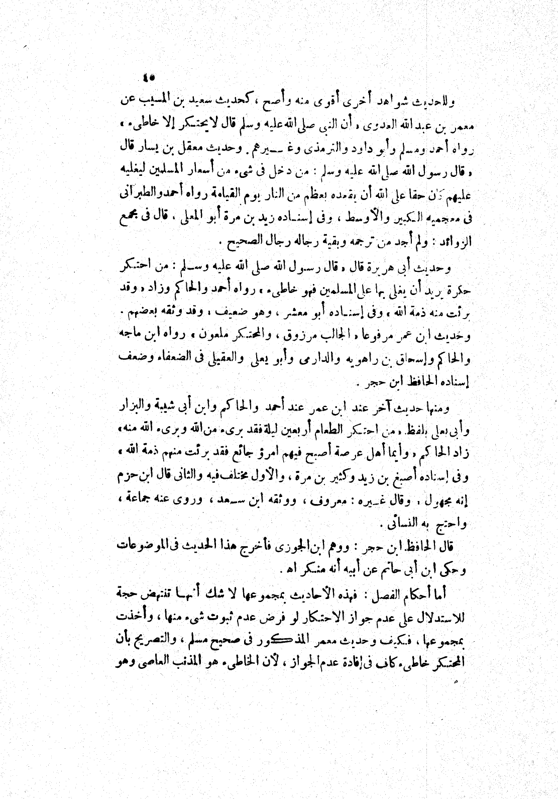 وحديث أَبِي هُرَيْرَةَ قَالَ " قَالَ رَسُولُ اللَّهِ صَلَّى اللَّهُ عَلَيْهِ وسلم: من احتكر حكرة يريد أن يغلى بها على المسلمين هو خاطئ " رواه أحمد والحاكم وزاد " وقد برئت منه ذمة الله " وفى إسناده أبو معشر، وهو ضعيف، وقد وثقه بعضهم.