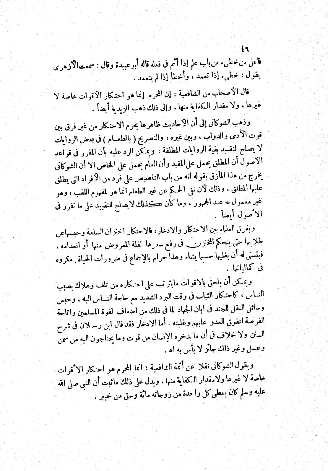 ويقول الشوكاني نقلا عن أئمة الشافعية: انما المحرم هو احتكار الاقوات خاصة لا غيرها ولا مقدار الكفاية منها، ويدل على ذلك ما ثَبَتَ أَنَّ النَّبِيَّ صَلَّى اللَّهُ عَلَيْهِ وَسَلَّمَ كَانَ يعطى كل واحدة من زوجاته مائة وسق من خيبر.
