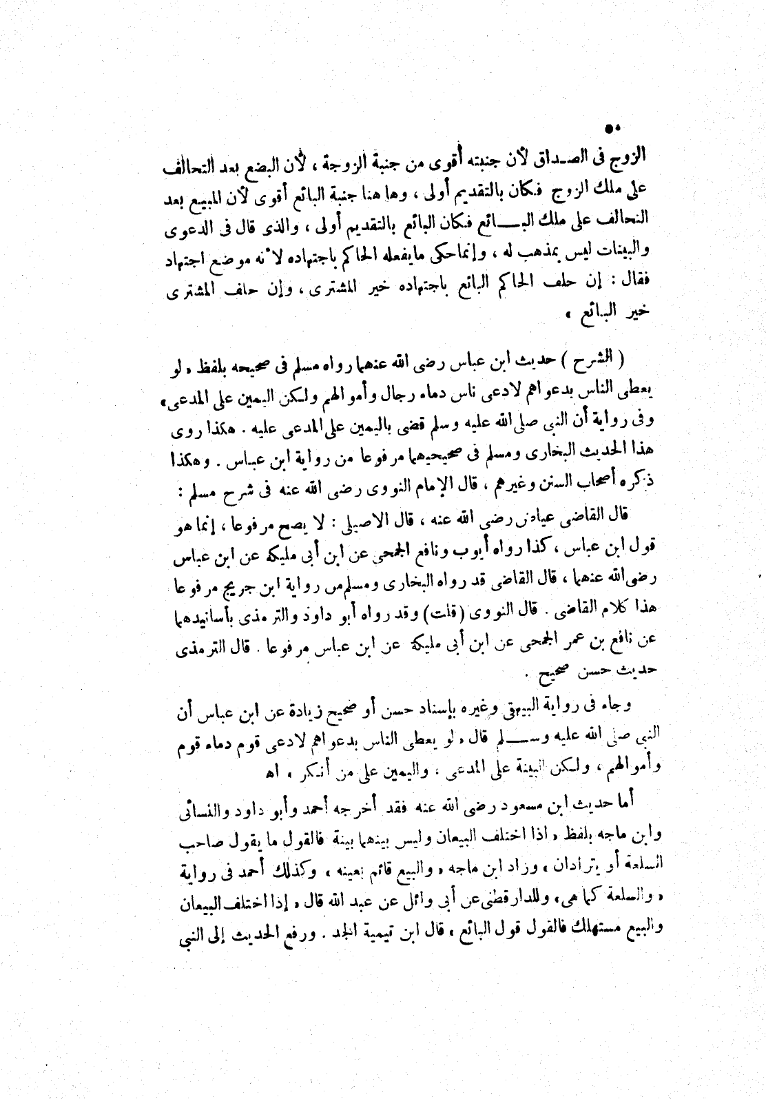 وجاء في رواية البيهقى وغيره بإسناد حسن أو صحيح زيادة عَنْ ابْنِ عَبَّاسٍ أَنَّ النَّبِيَّ صَلَّى اللَّهُ عَلَيْهِ وَسَلَّمَ قَالَ " لو يعطى الناس بدعواهم لادعى قوم دماء قوم وأموالهم، ولكن البينة على المدعى، واليمين على من أنكر " اه أما حديث ابن مسعود رضى الله عنه فقد أخرجه أحمد وأبو داود والنسائي وابن ماجه بلفظ " إذا اختلف البيعان وليس بينهما بينة فالقول ما يقول صاحب السلعة أو يترادان " وزاد ابن ماجه " والبيع قائم بعينه " وكذلك أحمد في رواية " والسلعة كما هي " وللدارقطني عن أبى وائل عن عبد الله قال " إذا اختلف البيعان والبيع مستهلك فالقول قول البائع " قال ابن تيمية الجد.