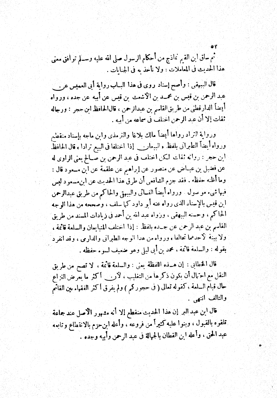 ورواه أيضا النسائي والبيهقي والحاكم من طريق عبد الرحمن ابن قيس بالاسناد الذى رواه عنه أبو داود كما سلف، وصححه من هذا الوجه الحاكم، وحسنه البيهقى، ورواه عبد الله بن أحمد في زيادات المسند من طريق القاسم بن عبد الرحمن عن جده بلفظ: إذا اختلف المتبايعان والسلعة قائمة، ولا بينة لاحدهما تحالفا " ورواه من هذا الوجه الطبراني والدارمى، وقد انفرد بقوله: والسلعة قائمة، محمد بن أبى ليلى وهو ضعيف لسوء حفظه.