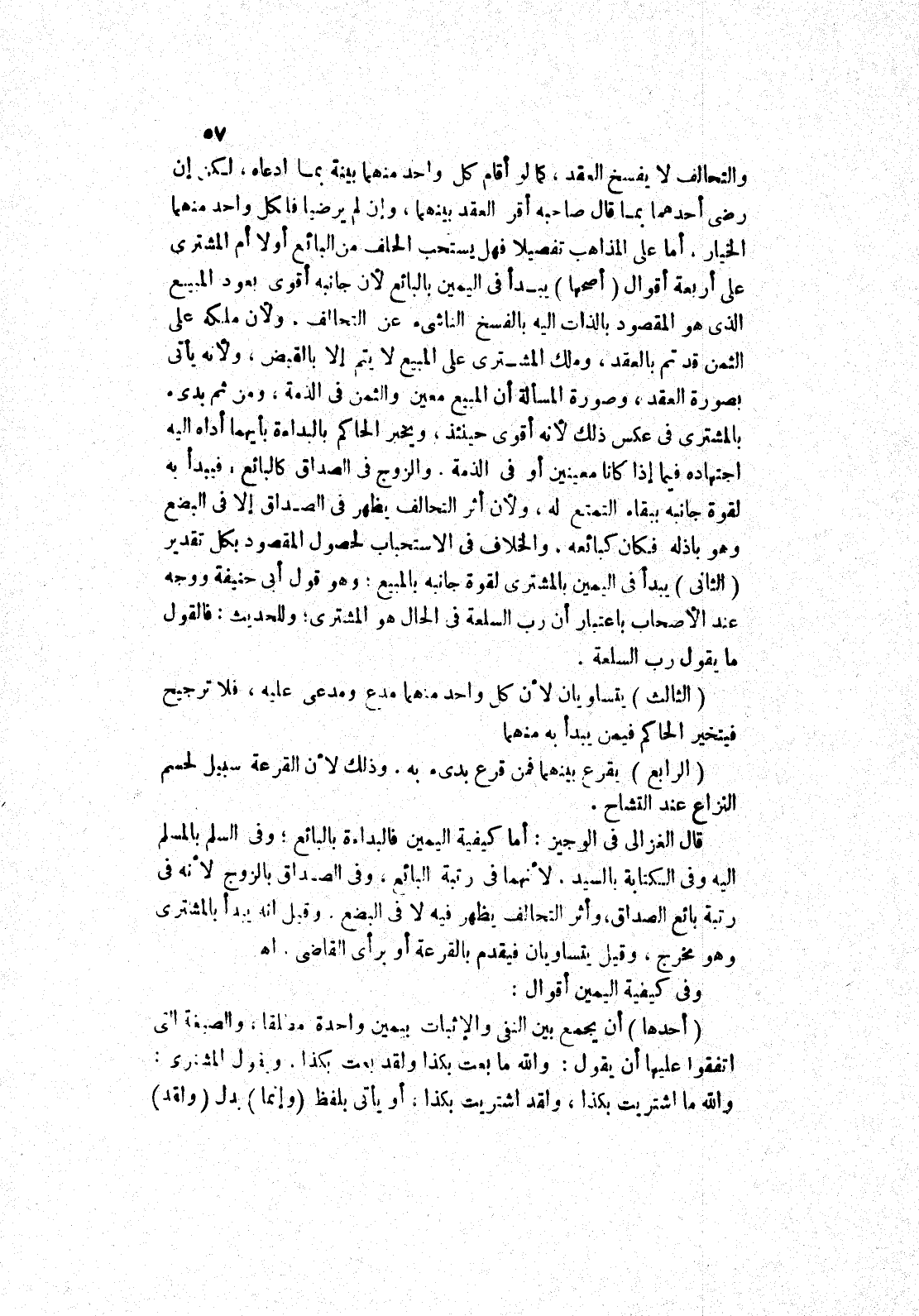 أما على المذاهب تفصيلا فهل يستحب الحلف من البائع أو لا أم المشترى على أربعة أقوال (أصحها) يبدأ في اليمين بالبائع لان جانبه أقوى بعود المبيع الذى هو المقصود بالذات إليه بالفسخ الناشئ عن التحالف، ولان ملكه على الثمن قد تم بالعقد، وملك المشترى على المبيع لا يتم إلا بالقبض، ولانه يأتي بصورة العقد، وصورة المسألة أن المبيع معين والثمن في الذمة، ومن ثم بدئ بالمشترى في عكس ذلك لانه أقوى حينئذ، ويخبر الحاكم بالبداءة بأيهما أداه إليه اجتهاده فيما إذا كانا معينين أو في الذمة.