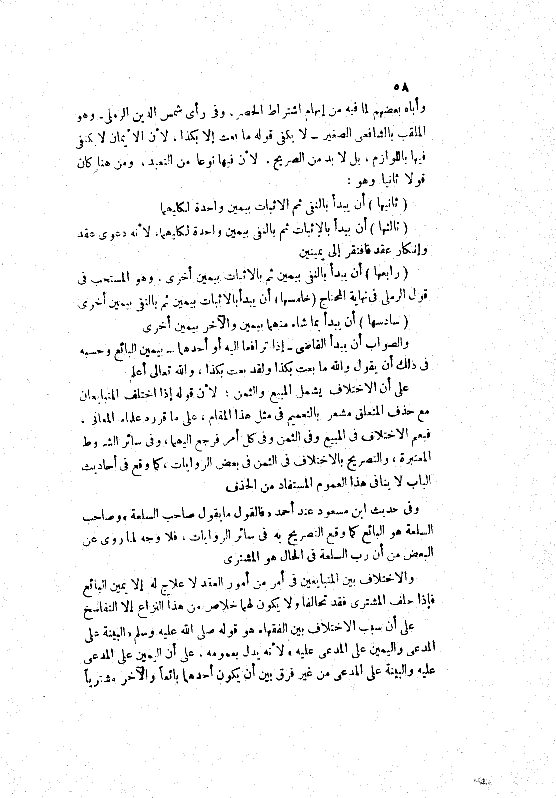 لان فيها نوعا من التعبد، ومن هنا كان قولا ثانيا وهو: (ثانيها) أن يبدأ بالنفى ثم الاثبات بيمين واحدة لكليهما (ثالثها) أن يبدأ بالاثبات ثم بالنفى بيمين واحدة لكليهما، لانه دعوى عقد وإنكار عقد فافتقر إلى يمينين (رابعها) أن يبدأ بالنفى بيمين ثم بالاثبات بيمين أخرى، وهو المستحب في قول الرملي في نهاية المحتاج (خامسها) أن يبدأ بالاثبات بيمين ثم بالنفى بيمين أخرى (سادسها) أن يبدأ بما شاء منهما بيمين والآخر بيمين أخرى والصواب أن يبدأ القاضى - إذا ترافعا إليه أو أحدهما - بيمين البائع وحسبه في ذلك أن يقول والله ما بعت بكذا ولقد بعت بكذا، والله تعالى أعلم على أن الاختلاف يشمل المبيع والثمن، لان قوله إذا اختلف المتبايعان مع حذف المتعلق مشعر بالتعميم في مثل هذا المقام، على ما قرره علماء المعاني، فيعم الاختلاف في المبيع وفى الثمن وفى كل أمر فرجع اليهما، وفى سائر الشروط المعتبرة، والتصريح بالاختلاف في الثمن في بعض الروايات، كما وقع في أحاديث الباب لا ينافى هذا العموم المستفاد من الحذف وفى حديث ابن مسعود عند أحمد " فالقول ما يقول صاحب السلعة " وصاحب