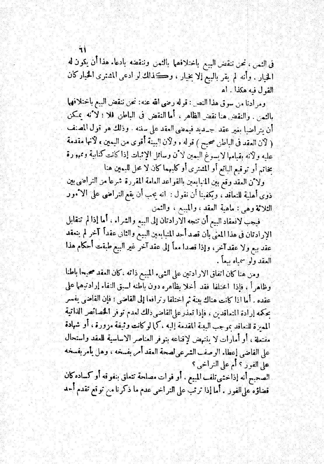 وذلك هو قول المصنف (لان العقد في الباطن صحيح) قوله " ولان البينة أقوى من اليمين " لانها مقدمة عليه ولانه بقيامها لا يسوغ اليمين لان وسائل الاثبات إذا كانت كتابية وممهورة بخاتم أو توقيع البائع أو المشترى أو كليهما كان لا محل لليمين هنا ولان العقد وقع بين المتبايعين بالقواعد العامة المقررة شرعا من التراضي بين ذوى أهلية للتعاقد، ويكفينا أن نقول: انه يجب أن يقع التراضي على الامور الثلاثة وهى: ماهية العقد، والمبيع، والثمن فيجب لانعقاد البيع أن تتجه الارادتان إلى البيع والشراء، أما إذا لم تتقابل الارادتان في هذا المعنى بأن قصد أحد المتبايعين البيع والثانى عقدا آخر لم ينعقد عقد بيع ولا عقد آخر، وإذا قصدا معا إلى عقد آخر غير البيع طبقت أحكام هذا العقد ولو سمياه بيعا.