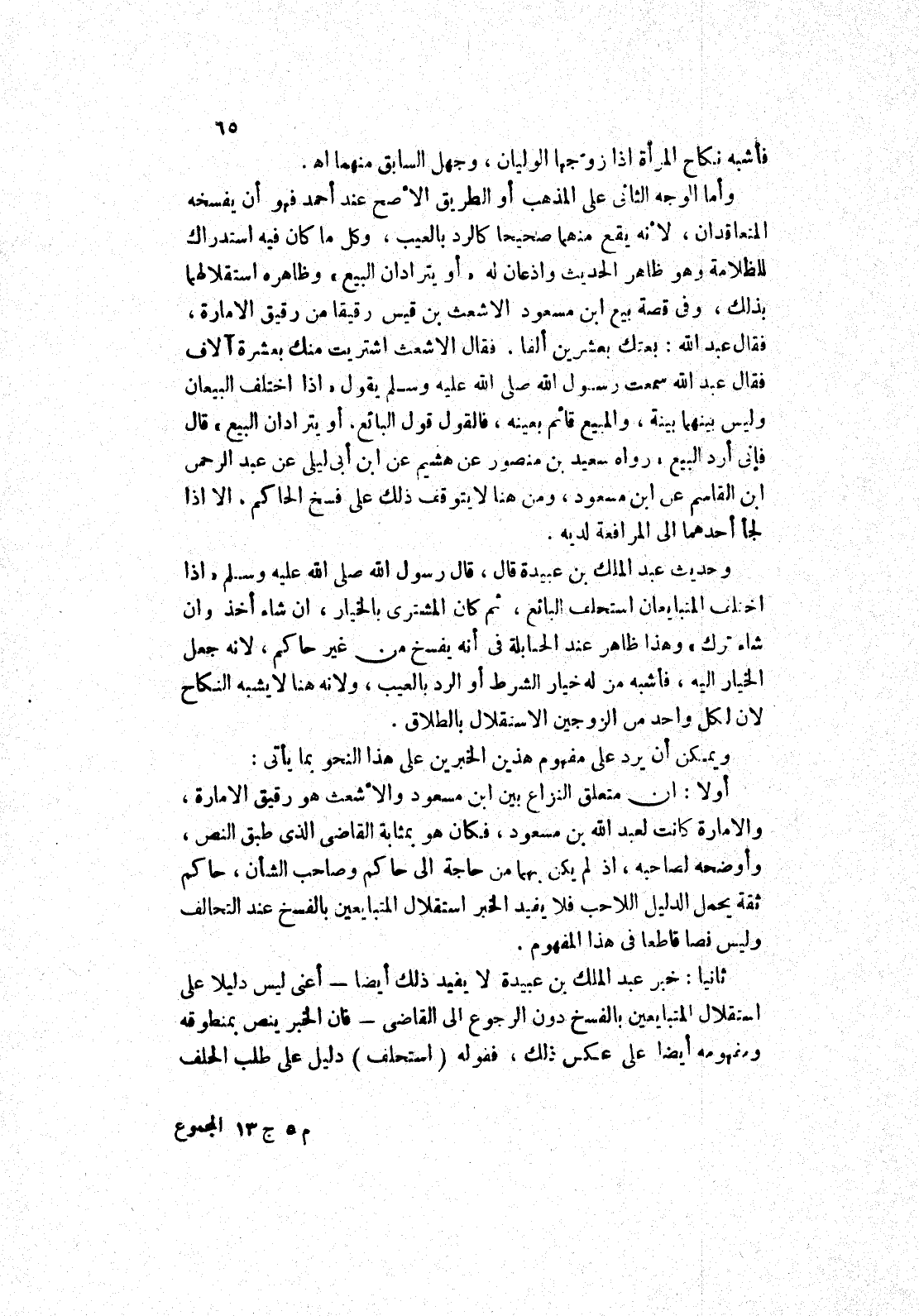 ويمكن أن يرد على مفهوم هذين الخبرين على هذا النحو بما يأتي: أولا: ان متعلق النزاع بين ابن مسعود والاشعث هو رقيق الامارة، والامارة كانت لعبد الله بن مسعود، فكان هو بمثابة القاضى الذى طبق النص، وأوضحه لصاحبه، إذ لم يكن بهما من حاجة إلى حاكم وصاحب الشأن، حاكم ثقة يحمل الدليل اللاحب فلا يفيد الخبر استقلال المتبايعين بالفسخ عند التحالف وليس نصا قاطعا في هذا المفهوم.