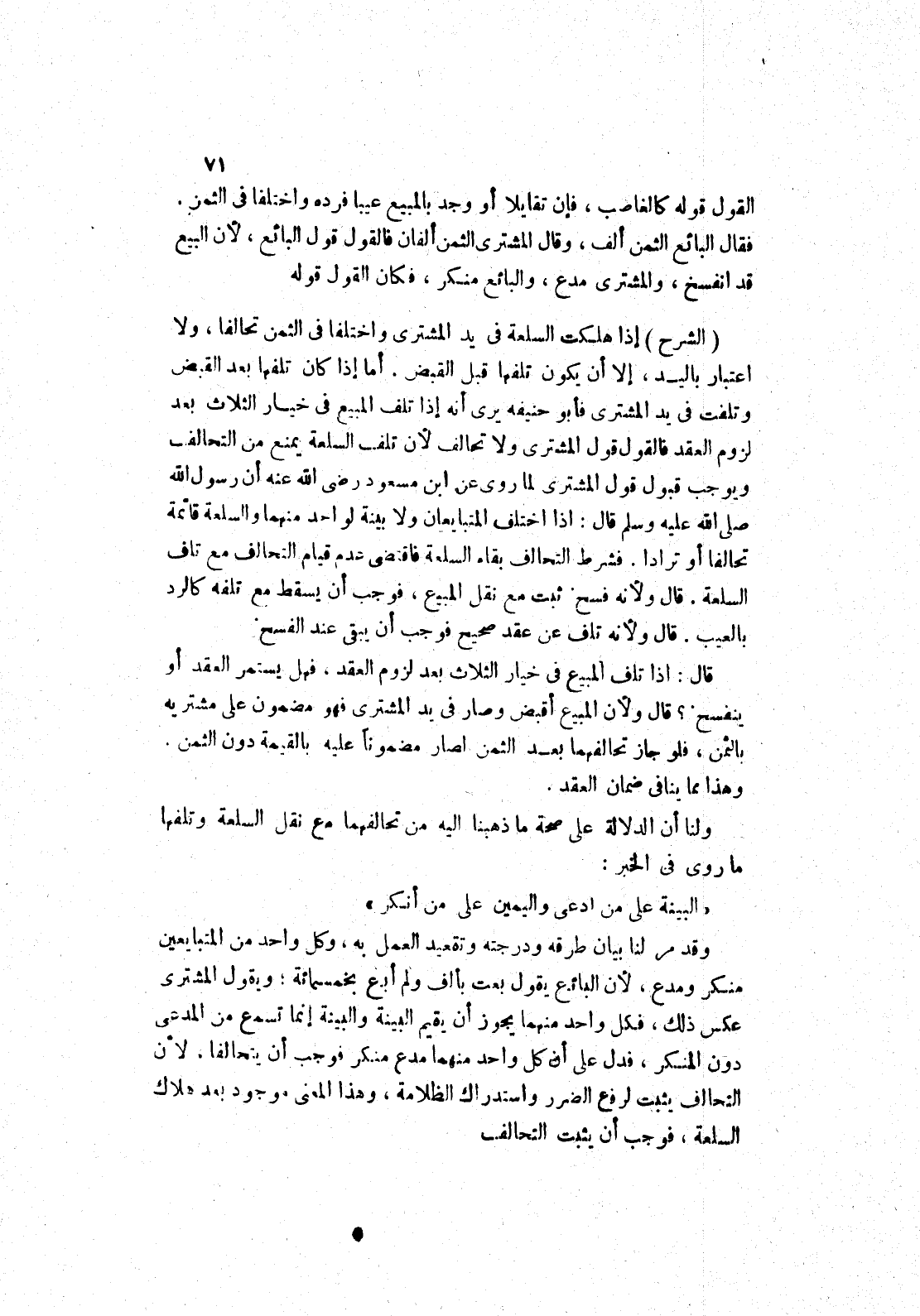 ولنا أن الدلالة على صحة ما ذهبنا إليه من تحالفهما مع نقل السلعة وتلفها ما روى في الخبر: " البينة على من ادعى واليمين على من أنكر " وقد مر لنا بيان طرقه ودرجته وتقعيد العمل به، وكل واحد من المتبايعين منكر ومدع، لان البائع يقول بعت بألف ولم أبع بخمسمائة، ويقول المشترى عكس ذلك، فكل واحد منهما يجوز أن يقيم البينة والبينة إنما تسمع من المدعى دون المنكر، فدل على أن كل واحد منهما مدع منكر فوجب أن يتحالفا، لان التحالف يثبت لرفع الضرر واستدراك الظلامة، وهذا المعنى موجود بعد هلاك السلعة، فوجب أن يثبت التحالف