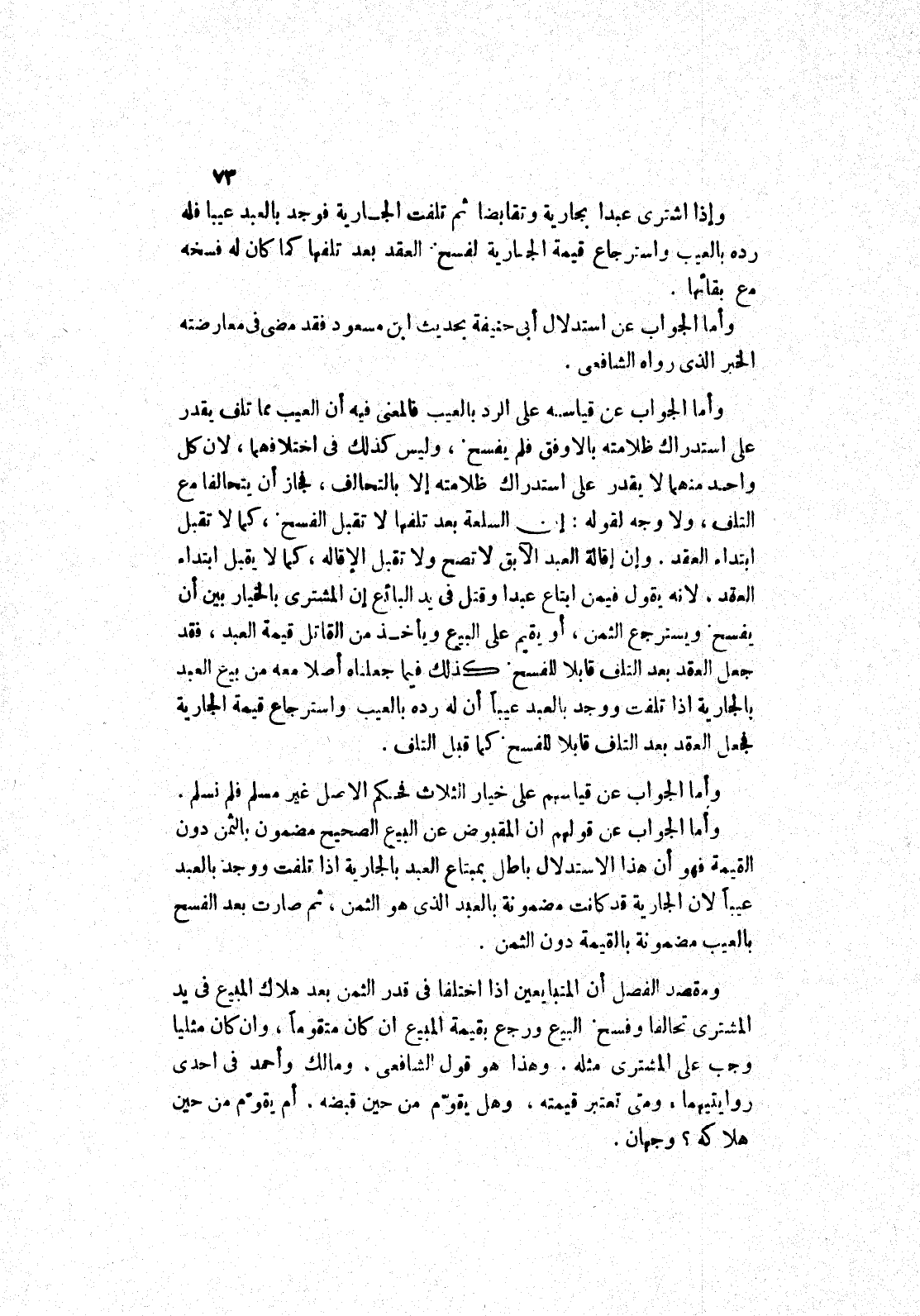 وأما الجواب عن قولهم ان المقبوض عن البيع الصحيح مضمون بالثمن دون القيمة فهو أن هذا الاستدلال باطل بمبتاع العبد بالجارية إذا تلفت ووجد بالعبد عيبا لان الجارية قد كانت مضمونة بالعبد الذى هو الثمن، ثم صارت بعد الفسخ بالعيب مضمونة بالقيمة دون الثمن.