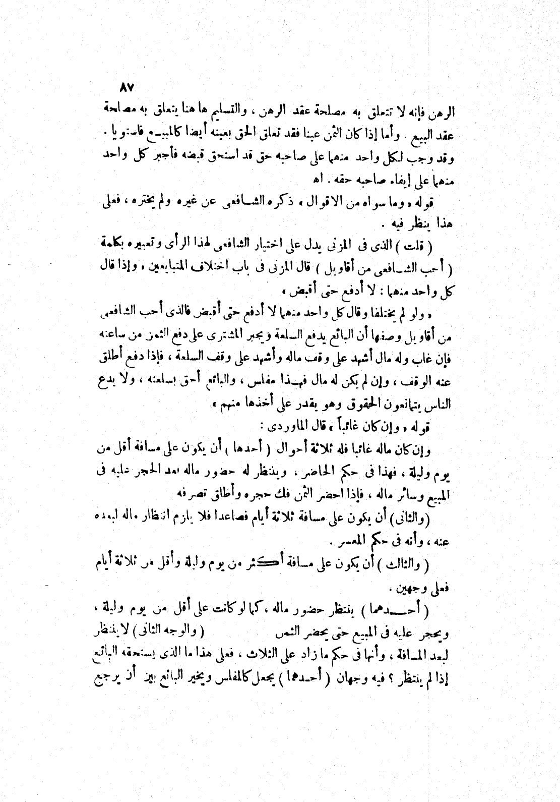 (قلت) الذى في المزني يدل على اختيار الشافعي لهذا الرأى وتعبيره بكلمة (أحب الشافعي من أقاويل) قال االمزنى في باب اختلاف المتبايعين " وإذا قال كل واحد منهما: لا أدفع حتى أقبض " " ولو لم يختلفا وقال كل واحد منهما لا أدفع حتى أقبض فالذي أحب الشافعي من أقاويل وصفها أن البائع يدفع السلعة ويجبر المشترى على دفع الثمن من ساعته فإن غاب وله مال أشهد على وقف ماله وأشهد على وقف السلعة، فإذا دفع أطلق عنه الوقف، وإن لم يكن له مال فهذا مفلس، والبائع أحق بسلعته، ولا يدع الناس يتمانعون الحقوق وهو يقدر على أخذها منهم " قوله " وإن كان غائبا " قال الماوردى: