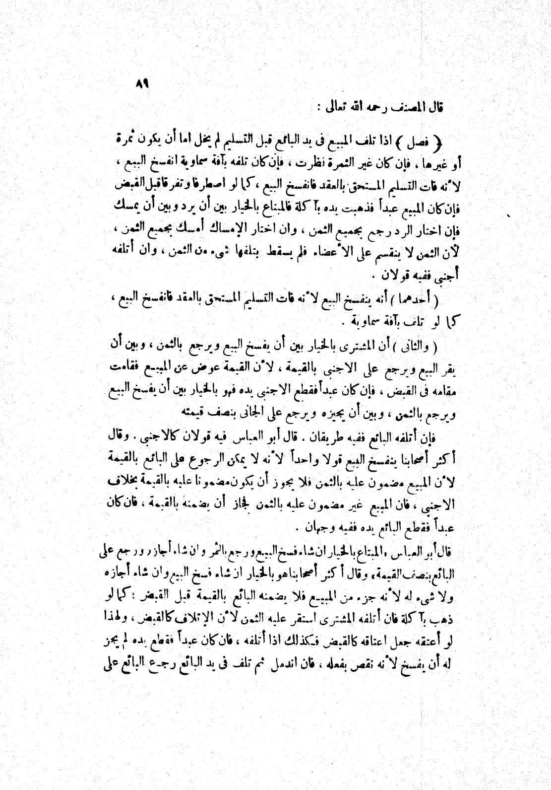 إذا تلف المبيع في يد البائع قبل التسليم لم يخل اما أن يكون ثمرة أو غيرها، فإن كان غير الثمرة نظرت، فإن كان تلفه بآفة سماوية انفسخ البيع، لانه فات التسليم المستحق بالعقد فانفسخ البيع، كما لو اصطرفا وتفرقا قبل القبض فإن كان المبيع عبدا فذهبت يده بآكلة فالمبتاع بالخيار بين أن يرد وبين أن يمسك