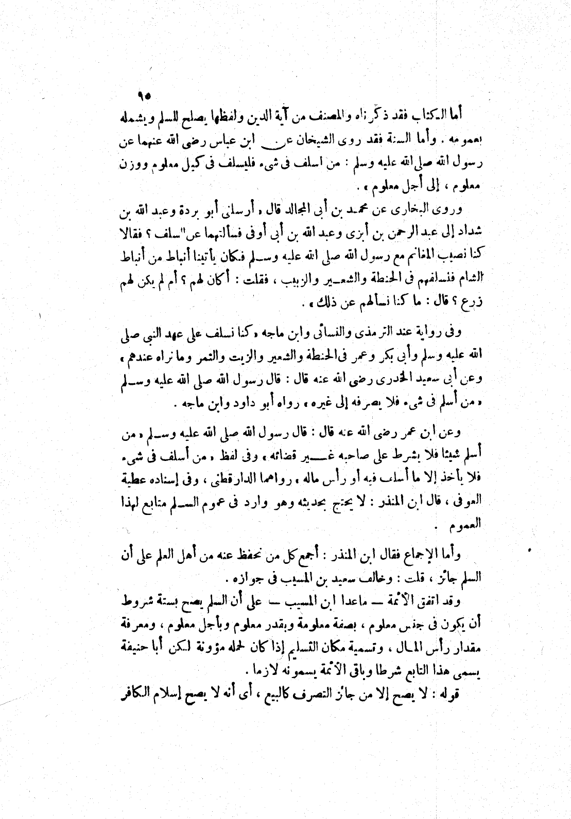 وروى البخاري عن محمد بن أبى المجالد قال " أرسلني أبو بردة وعبد الله بن شداد إلى عبد الرحمن بن أبزى وعبد الله بن أبى أوفى فسألتهما عن السلف؟ فقالا كنا نصيب المغانم مَعَ رَسُولِ اللَّهِ صَلَّى اللَّهُ عَلَيْهِ وَسَلَّمَ فكان يأتينا أنباط من أنباط