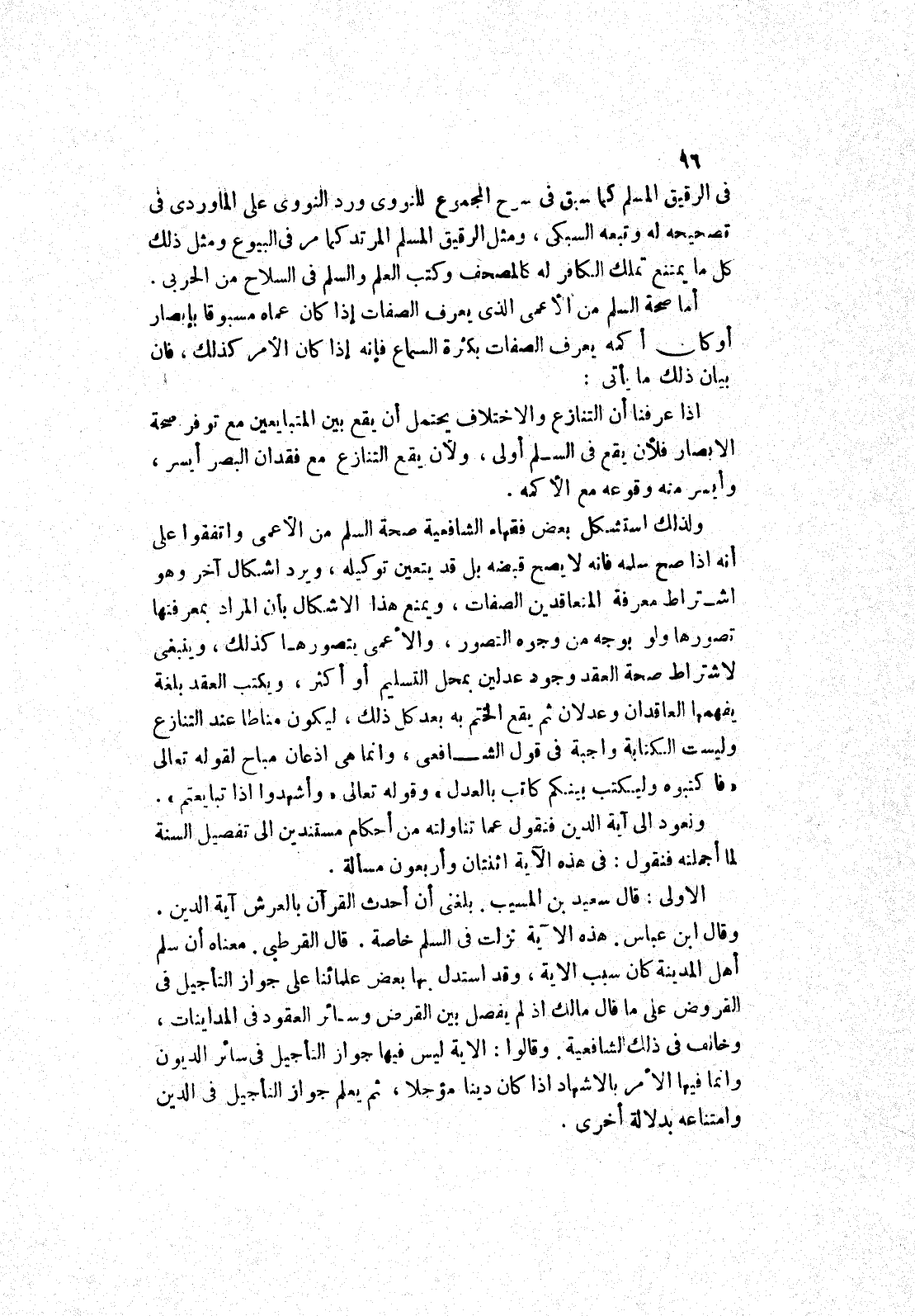 أما صحة السلم من الاعمى الذى يعرف الصفات إذا كان عماه مسبوقا بإبصار أو كان أكمه يعرف الصفات بكثرة السماع فإنه إذا كان الامر كذلك، فان بيان ذلك ما يأتي: إذا عرفنا أن التنازع والاختلاف يحتمل أن يقع بين المتبايعين مع توفر صحة الابصار فلان يقع في السلم أولى، ولان يقع التنازع مع فقدان البصر أيسر، وأيسر منه وقوعه مع الاكمه.