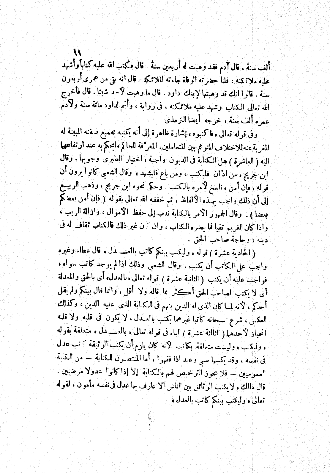 قال فأخرج الله تعالى الكتاب وشهد عليه ملائكته، في رواية، وأتم لداود مائة سنة ولآدم عمره ألف سنة، خرجه أيضا الترمذي وفى قوله تعالى " فاكتبوه " إشارة ظاهرة إلى أنه يكتبه بجميع صفته المبينة له المغربة عنه للاختلاف المتوهم بين المتعاملين، المعرفة للحاكم ما يحكم به عند ارتفاعهما إليه (العاشرة) هل الكتابة في الديون واجبة، اختيار الطبري وجوبها.