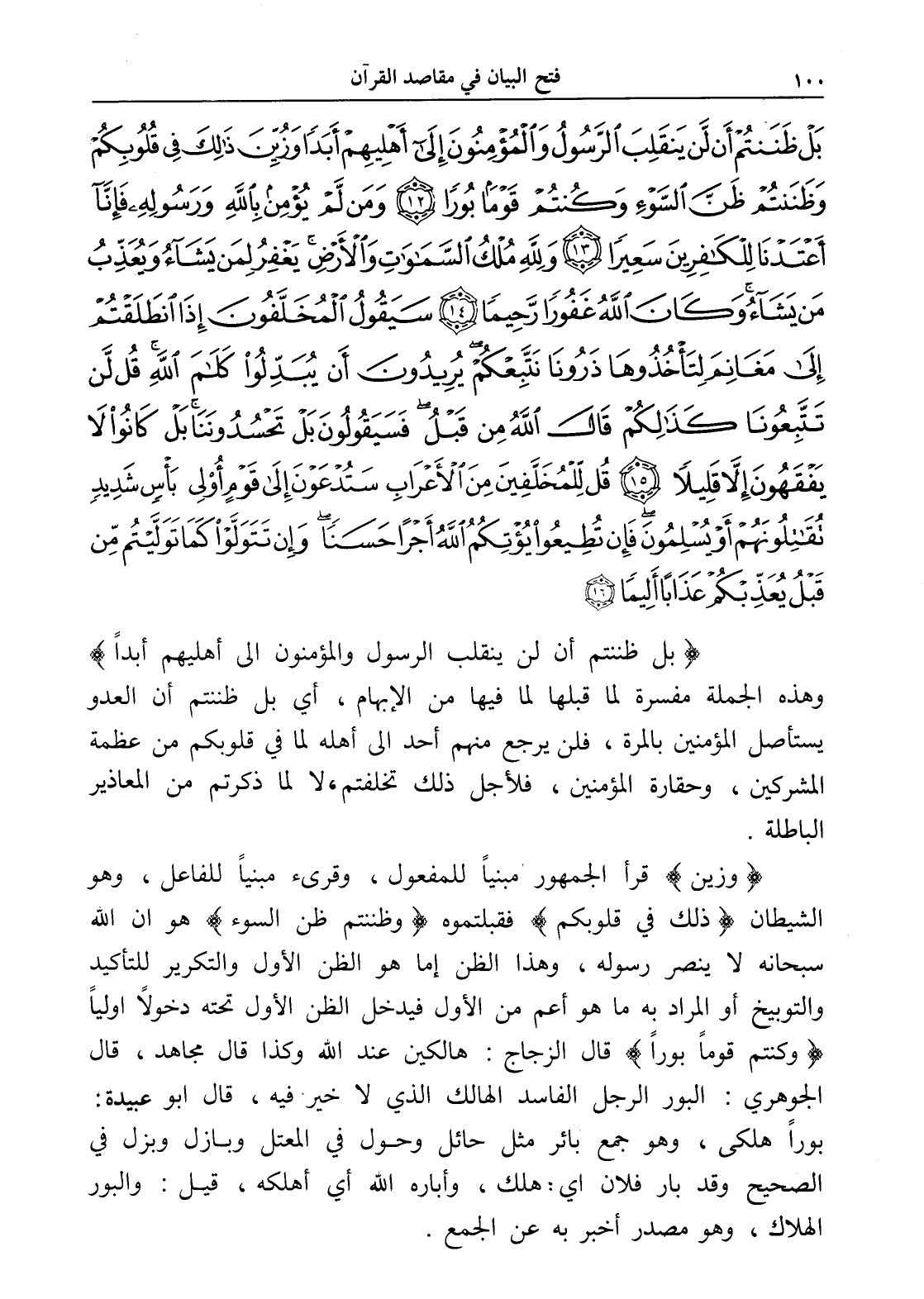 بَلْ ظَنَنْتُمْ أَنْ لَنْ يَنْقَلِبَ الرَّسُولُ وَالْمُؤْمِنُونَ إِلَى أَهْلِيهِمْ أَبَدًا وَزُيِّنَ ذَلِكَ فِي قُلُوبِكُمْ وَظَنَنْتُمْ ظَنَّ السَّوْءِ وَكُنْتُمْ قَوْمًا بُورًا (12) وَمَنْ لَمْ يُؤْمِنْ بِاللَّهِ وَرَسُولِهِ فَإِنَّا أَعْتَدْنَا لِلْكَافِرِينَ سَعِيرًا (13) وَلِلَّهِ مُلْكُ السَّمَاوَاتِ وَالْأَرْضِ يَغْفِرُ لِمَنْ يَشَاءُ وَيُعَذِّبُ مَنْ يَشَاءُ وَكَانَ اللَّهُ غَفُورًا رَحِيمًا (14) سَيَقُولُ الْمُخَلَّفُونَ إِذَا انْطَلَقْتُمْ إِلَى مَغَانِمَ لِتَأْخُذُوهَا ذَرُونَا نَتَّبِعْكُمْ يُرِيدُونَ أَنْ يُبَدِّلُوا كَلَامَ اللَّهِ قُلْ لَنْ تَتَّبِعُونَا كَذَلِكُمْ قَالَ اللَّهُ مِنْ قَبْلُ فَسَيَقُولُونَ بَلْ تَحْسُدُونَنَا بَلْ كَانُوا لَا يَفْقَهُونَ إِلَّا قَلِيلًا (15) قُلْ لِلْمُخَلَّفِينَ مِنَ الْأَعْرَابِ سَتُدْعَوْنَ إِلَى قَوْمٍ أُولِي بَأْسٍ شَدِيدٍ تُقَاتِلُونَهُمْ أَوْ يُسْلِمُونَ فَإِنْ تُطِيعُوا يُؤْتِكُمُ اللَّهُ أَجْرًا حَسَنًا وَإِنْ تَتَوَلَّوْا كَمَا تَوَلَّيْتُمْ مِنْ قَبْلُ يُعَذِّبْكُمْ عَذَابًا أَلِيمًا (16)