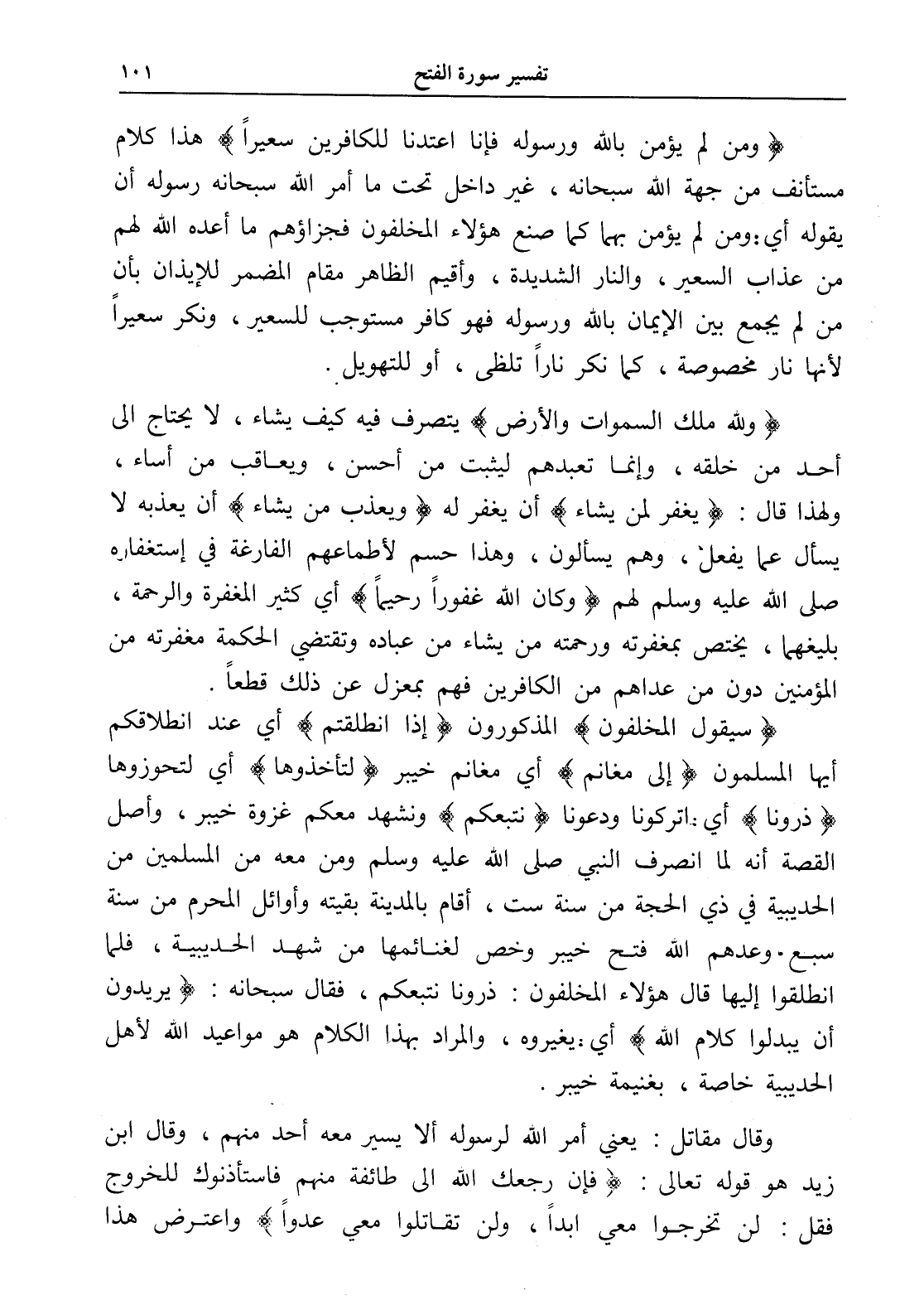 (سيقول المخلفون) المذكورون (إذا انطلقتم) أي عند انطلاقكم أيها المسلمون (إلى مغانم) أي مغانم خيبر (لتأخذوها) أي لتحوزوها (ذرونا) أي: اتركونا ودعونا (نتبعكم) ونشهد معكم غزوة خيبر، وأصل القصة أنه لما انصرف النبي صلى الله عليه وسلم ومن معه من المسلمين من الحديبية في ذي الحجة من سنة ست، أقام بالمدينة بقيته وأوائل المحرم من سنة سبع. وعدهم الله فتح خيبر وخص لغنائمها من شهد الحديبية، فلما انطلقوا إليها قال هؤلاء المخلفون: ذرونا نتبعكم، فقال سبحانه: (يريدون أن يبدلوا كلام الله) أي: يغيروه، والمراد بهذا الكلام هو مواعيد الله لأهل الحديبية خاصة، بغنيمة خيبر.