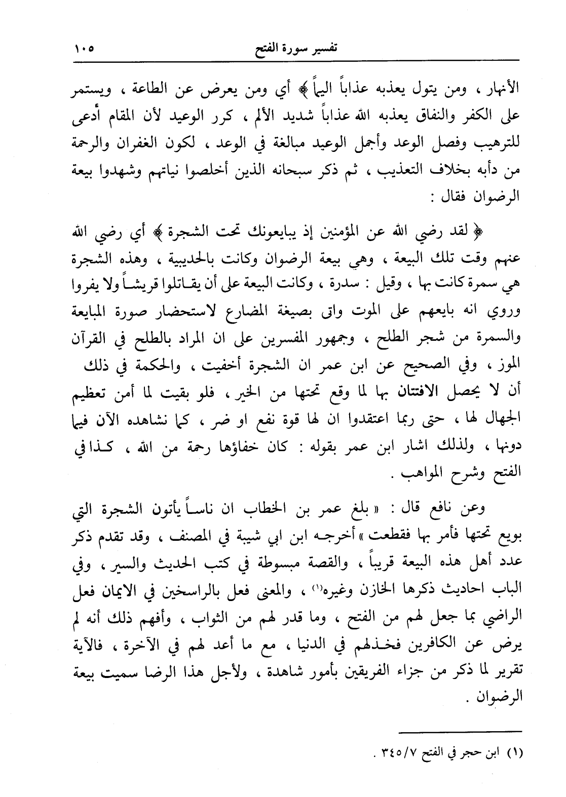 وعن نافع قال: " بلغ عمر بن الخطاب أن ناساً يأتون الشجرة التي بويع تحتها فأمر بها فقطعت " أخرجه ابن أبي شيبة في المصنف، وقد تقدم ذكر عدد أهل هذه البيعة قريباً، والقصة مبسوطة في كتب الحديث والسير، وفي الباب أحاديث ذكرها الخازن وغيره (¬1)، والمعنى فعل بالراسخين في الإيمان فعل الراضي بما جعل لهم من الفتح، وما قدر لهم من الثواب، وأفهم ذلك أنه لم يرض عن الكافرين فخذلهم في الدنيا، مع ما أعد لهم في الآخرة، فالآية تقرير لما ذكر من جزاء الفريقين بأمور شاهدة، ولأجل هذا الرضا سميت بيعة الرضوان.
