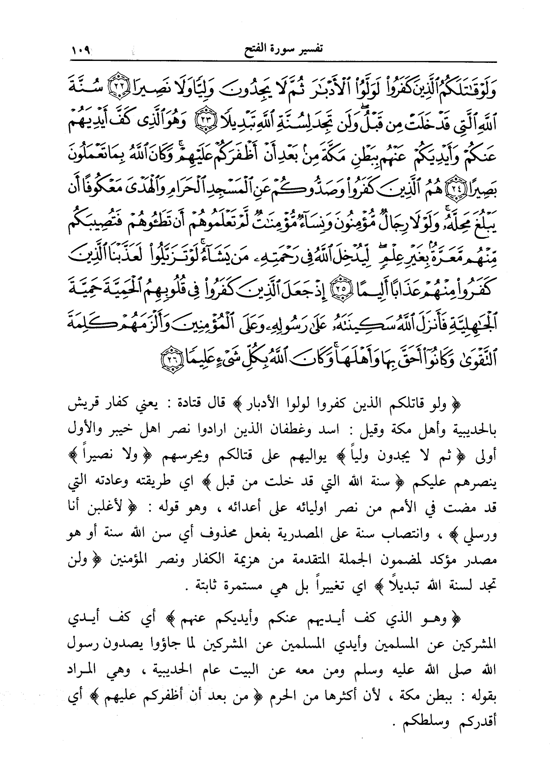وَلَوْ قَاتَلَكُمُ الَّذِينَ كَفَرُوا لَوَلَّوُا الْأَدْبَارَ ثُمَّ لَا يَجِدُونَ وَلِيًّا وَلَا نَصِيرًا (22) سُنَّةَ اللَّهِ الَّتِي قَدْ خَلَتْ مِنْ قَبْلُ وَلَنْ تَجِدَ لِسُنَّةِ اللَّهِ تَبْدِيلًا (23) وَهُوَ الَّذِي كَفَّ أَيْدِيَهُمْ عَنْكُمْ وَأَيْدِيَكُمْ عَنْهُمْ بِبَطْنِ مَكَّةَ مِنْ بَعْدِ أَنْ أَظْفَرَكُمْ عَلَيْهِمْ وَكَانَ اللَّهُ بِمَا تَعْمَلُونَ بَصِيرًا (24) هُمُ الَّذِينَ كَفَرُوا وَصَدُّوكُمْ عَنِ الْمَسْجِدِ الْحَرَامِ وَالْهَدْيَ مَعْكُوفًا أَنْ يَبْلُغَ مَحِلَّهُ وَلَوْلَا رِجَالٌ مُؤْمِنُونَ وَنِسَاءٌ مُؤْمِنَاتٌ لَمْ تَعْلَمُوهُمْ أَنْ تَطَئُوهُمْ فَتُصِيبَكُمْ مِنْهُمْ مَعَرَّةٌ بِغَيْرِ عِلْمٍ لِيُدْخِلَ اللَّهُ فِي رَحْمَتِهِ مَنْ يَشَاءُ لَوْ تَزَيَّلُوا لَعَذَّبْنَا الَّذِينَ كَفَرُوا مِنْهُمْ عَذَابًا أَلِيمًا (25) إِذْ جَعَلَ الَّذِينَ كَفَرُوا فِي قُلُوبِهِمُ الْحَمِيَّةَ حَمِيَّةَ الْجَاهِلِيَّةِ فَأَنْزَلَ اللَّهُ سَكِينَتَهُ عَلَى رَسُولِهِ وَعَلَى الْمُؤْمِنِينَ وَأَلْزَمَهُمْ كَلِمَةَ التَّقْوَى وَكَانُوا أَحَقَّ بِهَا وَأَهْلَهَا وَكَانَ اللَّهُ بِكُلِّ شَيْءٍ عَلِيمًا (26)