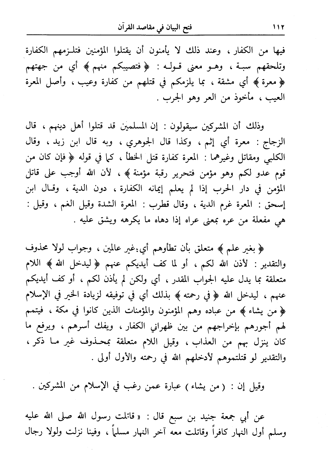 فيها من الكفار، وعند ذلك لا يأمنون أن يقتلوا المؤمنين فتلزمهم الكفارة وتلحقهم سبة، وهو معنى قوله: (فتصيبكم منهم) أي من جهتهم (معرة) أي مشقة، بما يلزمكم في قتلهم من كفارة وعيب، وأصل المعرة العيب، مأخوذ من العر وهو الجرب.