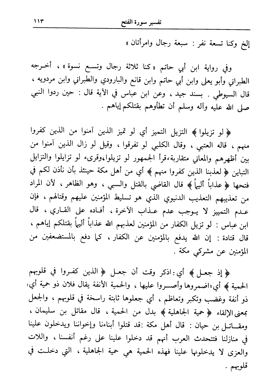 وفي رواية ابن أبي حاتم " كنا ثلاثة رجال وتسع نسوة "، أخرجه الطبراني وأبو يعلى وابن أبي حاتم وابن قانع والبارودي والطبراني وابن مردويه، قال السيوطي. بسند جيد، وعن ابن عباس في الآية قال: حين ردوا النبي صلى الله عليه وآله وسلم أن تطأوهم بقتلكم إياهم.
