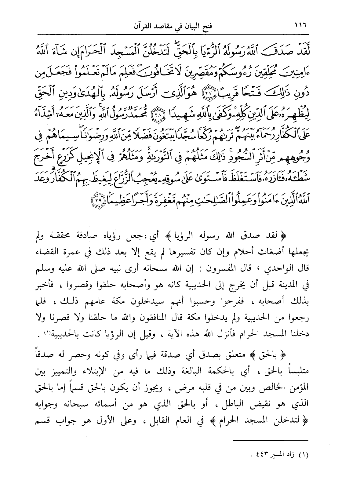 لَقَدْ صَدَقَ اللَّهُ رَسُولَهُ الرُّؤْيَا بِالْحَقِّ لَتَدْخُلُنَّ الْمَسْجِدَ الْحَرَامَ إِنْ شَاءَ اللَّهُ آمِنِينَ مُحَلِّقِينَ رُءُوسَكُمْ وَمُقَصِّرِينَ لَا تَخَافُونَ فَعَلِمَ مَا لَمْ تَعْلَمُوا فَجَعَلَ مِنْ دُونِ ذَلِكَ فَتْحًا قَرِيبًا (27) هُوَ الَّذِي أَرْسَلَ رَسُولَهُ بِالْهُدَى وَدِينِ الْحَقِّ لِيُظْهِرَهُ عَلَى الدِّينِ كُلِّهِ وَكَفَى بِاللَّهِ شَهِيدًا (28) مُحَمَّدٌ رَسُولُ اللَّهِ وَالَّذِينَ مَعَهُ أَشِدَّاءُ عَلَى الْكُفَّارِ رُحَمَاءُ بَيْنَهُمْ تَرَاهُمْ رُكَّعًا سُجَّدًا يَبْتَغُونَ فَضْلًا مِنَ اللَّهِ وَرِضْوَانًا سِيمَاهُمْ فِي وُجُوهِهِمْ مِنْ أَثَرِ السُّجُودِ ذَلِكَ مَثَلُهُمْ فِي التَّوْرَاةِ وَمَثَلُهُمْ فِي الْإِنْجِيلِ كَزَرْعٍ أَخْرَجَ شَطْأَهُ فَآزَرَهُ فَاسْتَغْلَظَ فَاسْتَوَى عَلَى سُوقِهِ يُعْجِبُ الزُّرَّاعَ لِيَغِيظَ بِهِمُ الْكُفَّارَ وَعَدَ اللَّهُ الَّذِينَ آمَنُوا وَعَمِلُوا الصَّالِحَاتِ مِنْهُمْ مَغْفِرَةً وَأَجْرًا عَظِيمًا (29)