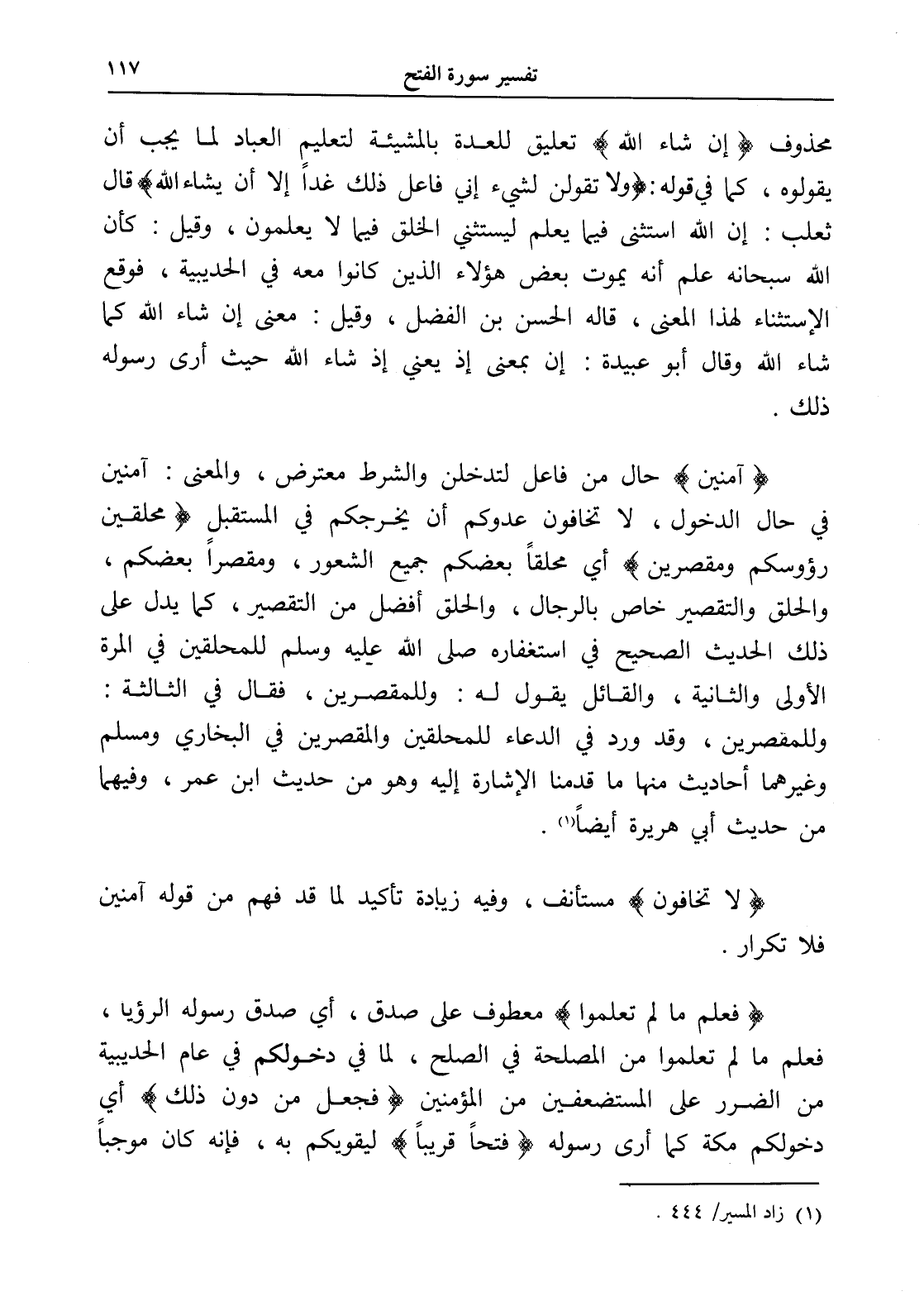 محذوف (إن شاء الله) تعليق للعدة بالمشيئة لتعليم العباد لما يجب أن يقولوه، كما في قوله: (وَلَا تَقُولَنَّ لِشَيْءٍ إِنِّي فَاعِلٌ ذَلِكَ غَدًا (23) إِلَّا أَنْ يَشَاءَ اللَّهُ) قال ثعلب: إن الله استثنى فيما يعلم ليستثني الخلق فيما لا يعلمون، وقيل: كأن الله سبحانه علم أنه يموت بعض هؤلاء الذين كانوا معه في الحديبية، فوقع الإستثناء لهذا المعنى، قاله الحسن بن الفضل، وقيل: معنى إن شاء الله كما شاء الله وقال أبو عبيدة: إن بمعنى إذ يعني إذ شاء الله حيث أرى رسوله ذلك.