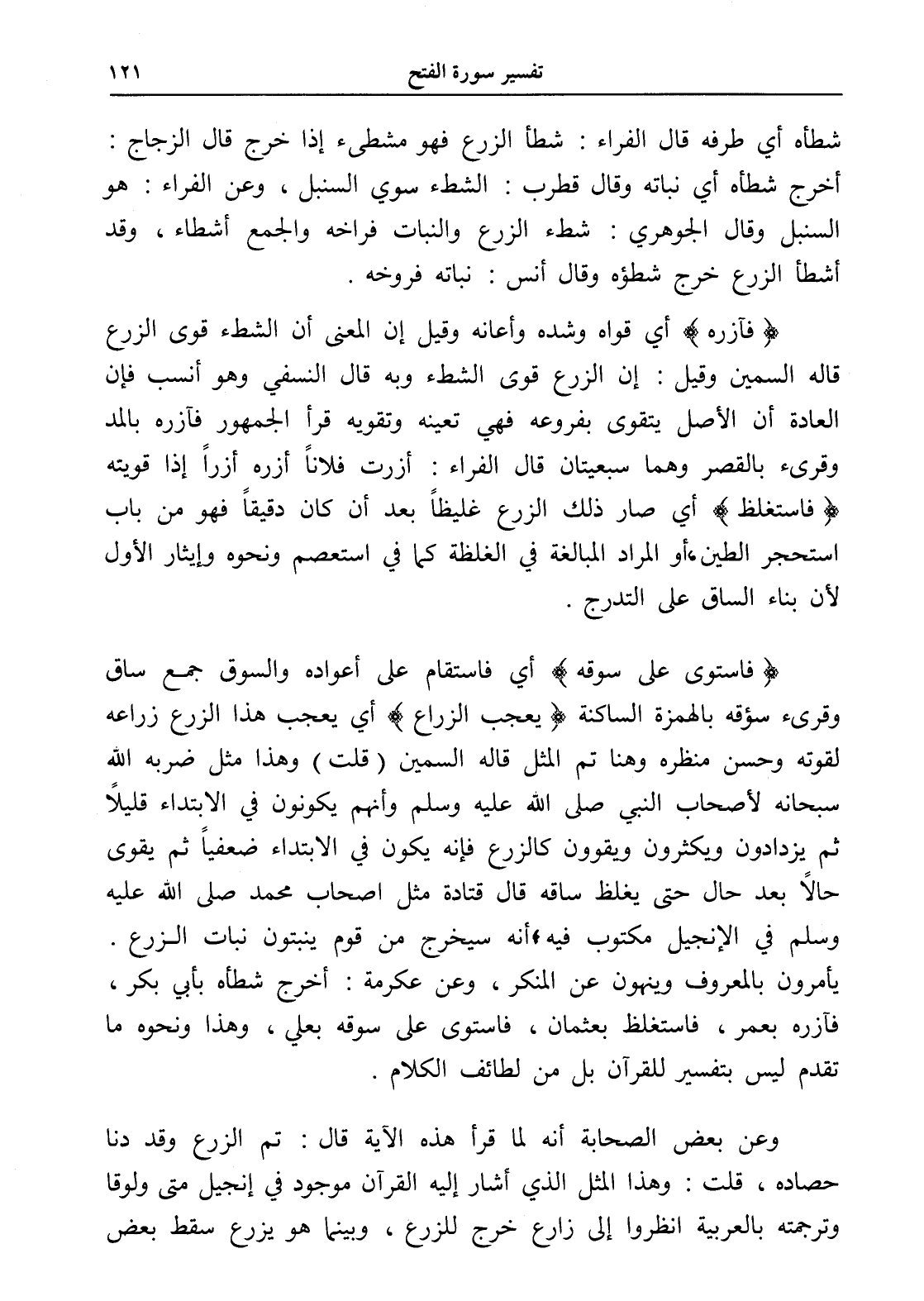 وعن بعض الصحابة أنه لما قرأ هذه الآية قال: تم الزرع وقد دنا حصاده، قلت: وهذا المثل الذي أشار إليه القرآن موجود في إنجيل متى ولوقا وترجمته بالعربية انظروا إلى زارع خرج للزرع، وبينما هو يزرع سقط بعض