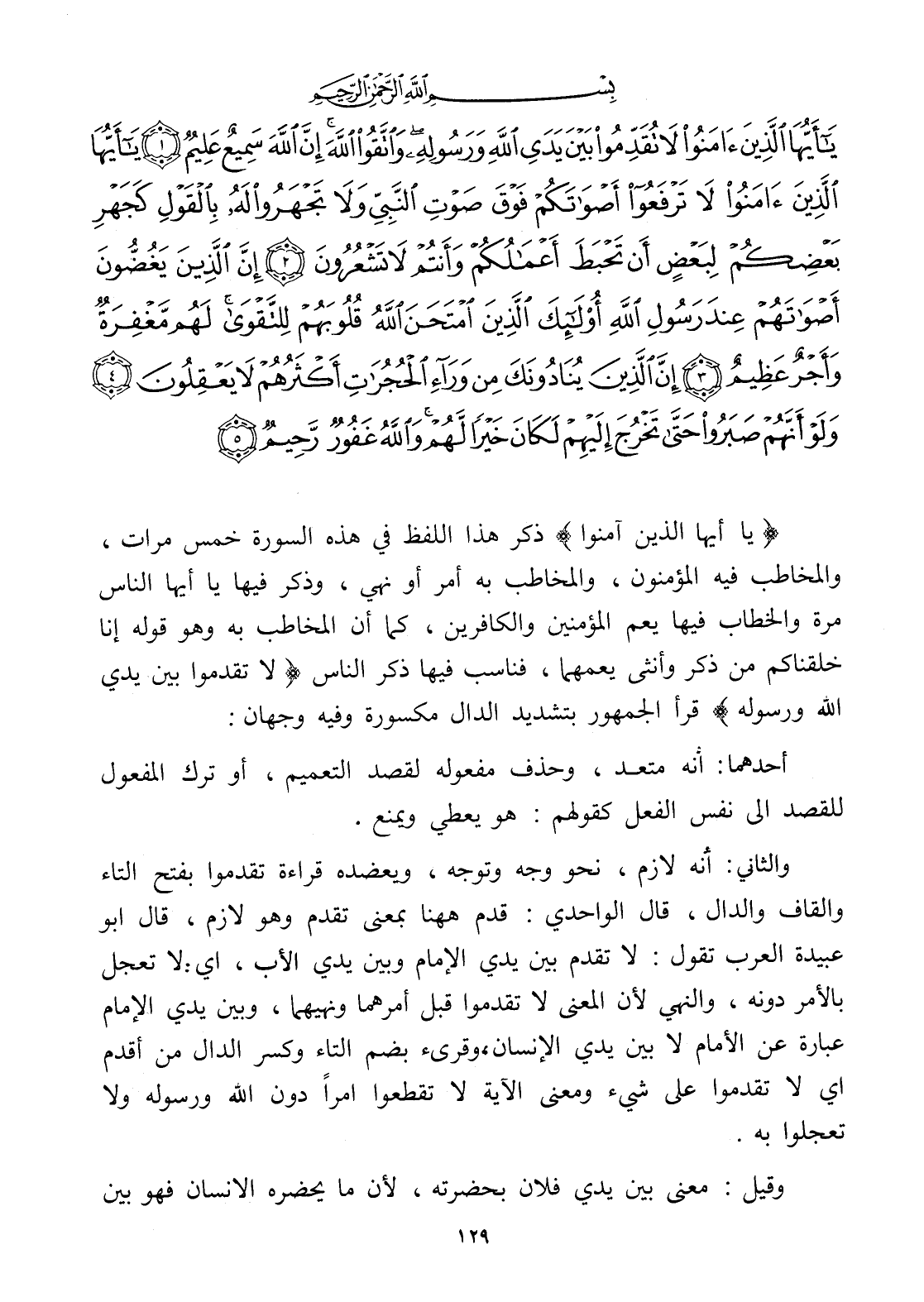 يَا أَيُّهَا الَّذِينَ آمَنُوا لَا تُقَدِّمُوا بَيْنَ يَدَيِ اللَّهِ وَرَسُولِهِ وَاتَّقُوا اللَّهَ إِنَّ اللَّهَ سَمِيعٌ عَلِيمٌ (1) يَا أَيُّهَا الَّذِينَ آمَنُوا لَا تَرْفَعُوا أَصْوَاتَكُمْ فَوْقَ صَوْتِ النَّبِيِّ وَلَا تَجْهَرُوا لَهُ بِالْقَوْلِ كَجَهْرِ بَعْضِكُمْ لِبَعْضٍ أَنْ تَحْبَطَ أَعْمَالُكُمْ وَأَنْتُمْ لَا تَشْعُرُونَ (2) إِنَّ الَّذِينَ يَغُضُّونَ أَصْوَاتَهُمْ عِنْدَ رَسُولِ اللَّهِ أُولَئِكَ الَّذِينَ امْتَحَنَ اللَّهُ قُلُوبَهُمْ لِلتَّقْوَى لَهُمْ مَغْفِرَةٌ وَأَجْرٌ عَظِيمٌ (3) إِنَّ الَّذِينَ يُنَادُونَكَ مِنْ وَرَاءِ الْحُجُرَاتِ أَكْثَرُهُمْ لَا يَعْقِلُونَ (4) وَلَوْ أَنَّهُمْ صَبَرُوا حَتَّى تَخْرُجَ إِلَيْهِمْ لَكَانَ خَيْرًا لَهُمْ وَاللَّهُ غَفُورٌ رَحِيمٌ (5)