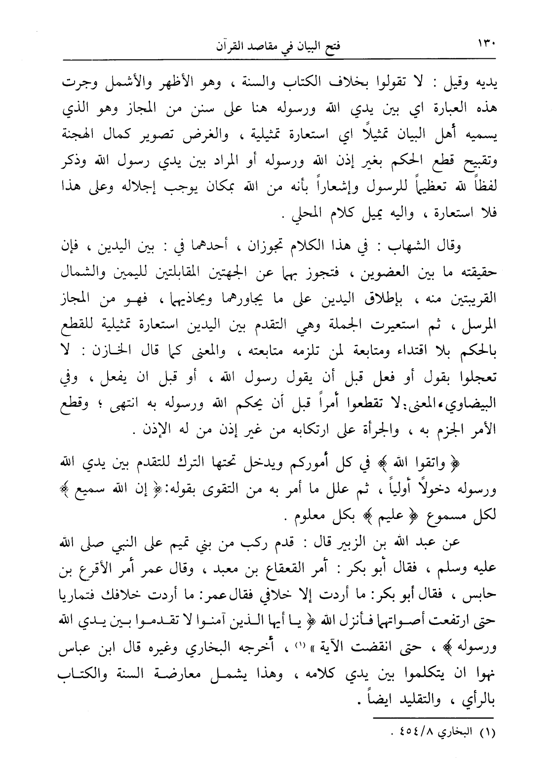 عن عبد الله بن الزبير قال: قدم ركب من بني تميم على النبي صلى الله عليه وسلم، فقال أبو بكر: أمر القعقاع بن معبد، وقال عمر أمر الأقرع بن حابس، فقال أبو بكر: ما أردت إلا خلافي فقال عمر: ما أردت خلافك فتماريا حتى ارتفعت أصواتهما فأنزل الله (يا أيها الذين آمنوا لا تقدموا بين يدي الله ورسوله)، حتى انقضت الآية " (¬1)، أخرجه البخاري وغيره قال ابن عباس نهوا أن يتكلموا بين يدي كلامه، وهذا يشمل معارضة السنة والكتاب بالرأي، والتقليد أيضاًً.