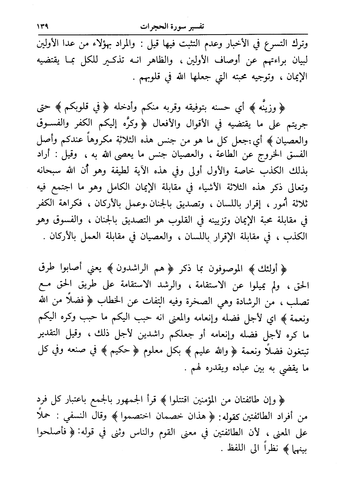 (وزينَّه) أي حسنه بتوفيقه وقربه منكم وأدخله (في قلوبكم) حتى جريتم على ما يقتضيه في الأقوال والأفعال (وكرَّه إليكم الكفر والفسوق والعصيان) أي: جعل كل ما هو من جنس هذه الثلاثة مكروهاً عندكم وأصل الفسق الخروج عن الطاعة، والعصيان جنس ما يعصى الله به، وقيل: أراد بذلك الكذب خاصة والأول أولى وفي هذه الآية لطيفة وهو أن الله سبحانه وتعالى ذكر هذه الثلاثة الأشياء في مقابلة الإيمان الكامل وهو ما اجتمع فيه ثلاثة أمور، إقرار باللسان، وتصديق بالجنان وعمل بالأركان، فكراهة الكفر في مقابلة محبة الإيمان وتزيينه في القلوب هو التصديق بالجنان، والفسوق وهو الكذب، في مقابلة الإقرار باللسان، والعصيان في مقابلة العمل بالأركان.