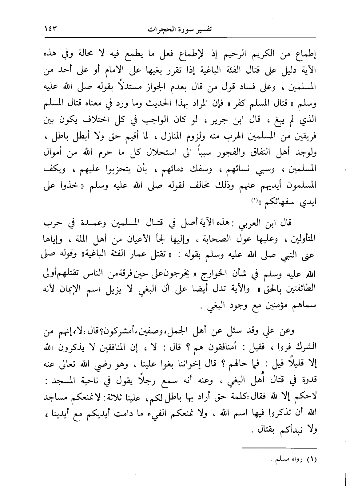 إطماع من الكريم الرحيم إذ لإطماع فعل ما يطمع فيه لا محالة وفي هذه الآية دليل على قتال الفئة الباغية إذا تقرر بغيها على الإمام أو على أحد من المسلمين، وعلى فساد قول من قال بعدم الجواز مستدلاً بقوله صلى الله عليه وسلم " قتال المسلم كفر " فإن المراد بهذا الحديث وما ورد في معناه قتال المسلم الذي لم يبغ، قال ابن جرير، لو كان الواجب في كل اختلاف يكون بين فريقين من المسلمين الهرب منه ولزوم المنازل، لما أقيم حق ولا أبطل باطل، ولوجد أهل النفاق والفجور سبباً إلى استحلال كل ما حرم الله من أموال المسلمين، وسبي نسائهم، وسفك دمائهم، بأن يتحزبوا عليهم، ويكف المسلمون أيديهم عنهم وذلك مخالف لقوله صلى الله عليه وسلم " خذوا على أيدي سفهائكم " (¬1).