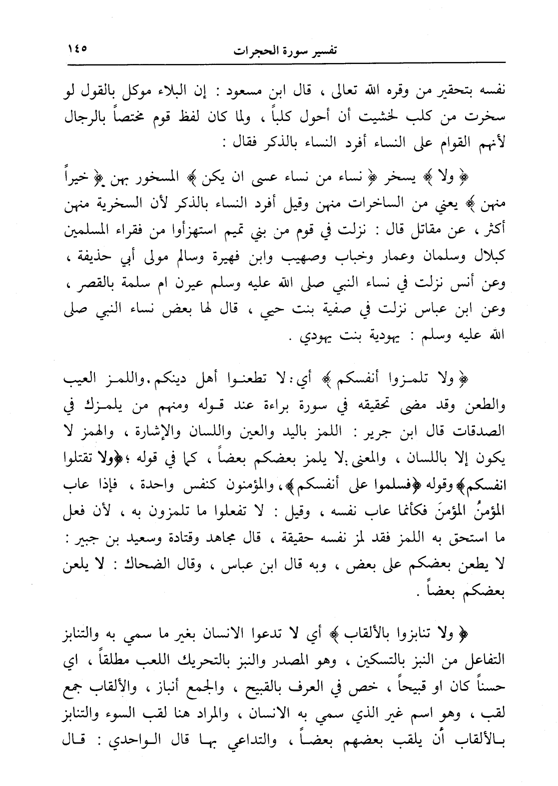 (ولا) يسخر (نساء من نساء عسى أن يكن) المسخور بهن (خيراً منهن) يعني من الساخرات منهن وقيل أفرد النساء بالذكر لأن السخرية منهن أكثر، عن مقاتل قال: نزلت في قوم من بني تميم استهزأوا من فقراء المسلمين كبلال وسلمان وعمار وخباب وصهيب وابن فهيرة وسالم مولى أبي حذيفة، وعن أنس نزلت في نساء النبي صلى الله عليه وسلم عيرن أم سلمة بالقصر، وعن ابن عباس نزلت في صفية بنت حيي، قال لها بعض نساء النبي صلى الله عليه وسلم: يهودية بنت يهودي.