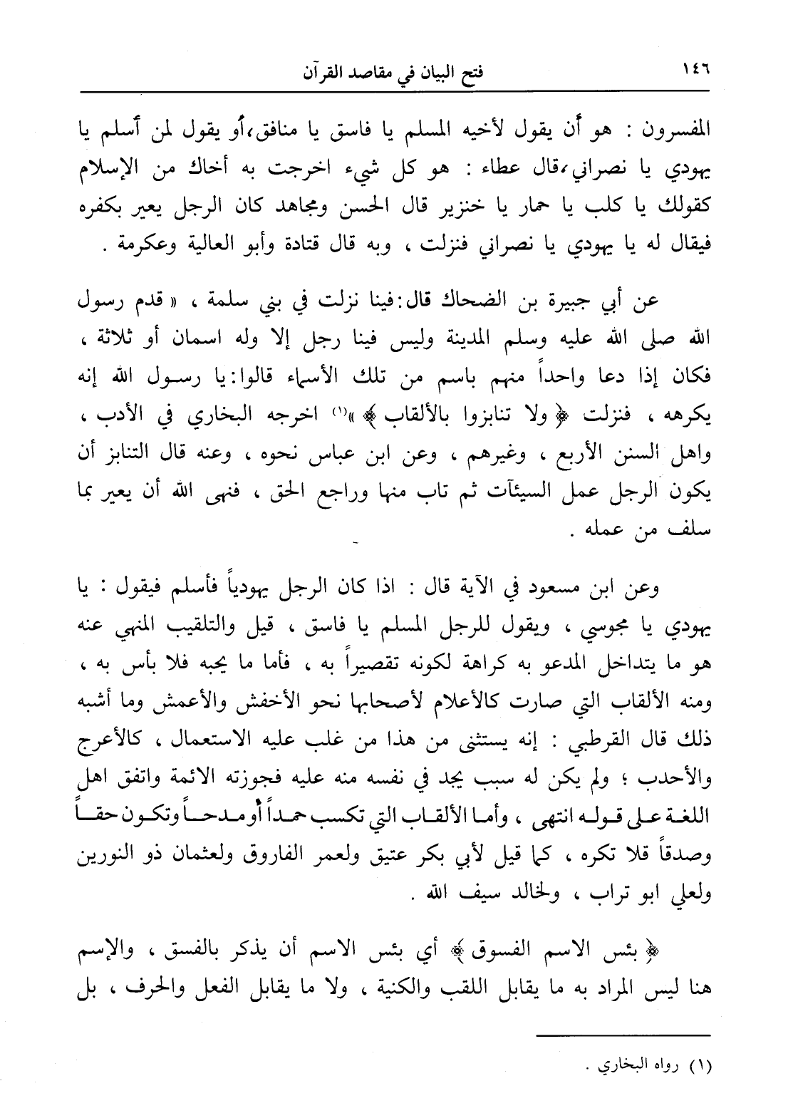 وعن ابن مسعود في الآية قال: إذا كان الرجل يهودياً فأسلم فيقول: يا يهودي يا مجوسي، ويقول للرجل المسلم يا فاسق، قيل والتلقيب المنهي عنه هو ما يتداخل المدعو به كراهة لكونه تقصيراً به، فأما ما يحبه فلا بأس به، ومنه الألقاب التي صارت كالأعلام لأصحابها نحو الأخفش والأعمش وما أشبه ذلك قال القرطبي: إنه يستثنى من هذا من غلب عليه الاستعمال، كالأعرج والأحدب؛ ولم يكن له سبب يجد في نفسه منه عليه فجوزته الأئمة واتفق أهل اللغة على قوله انتهى، وأما الألقاب التي تكسب حمداً أو مدحاً وتكون حقاً وصدقاً فلا تكره، كما قيل لأبي بكر عتيق ولعمر الفاروق ولعثمان ذو النورين ولعلي أبو تراب، ولخالد سيف الله.
