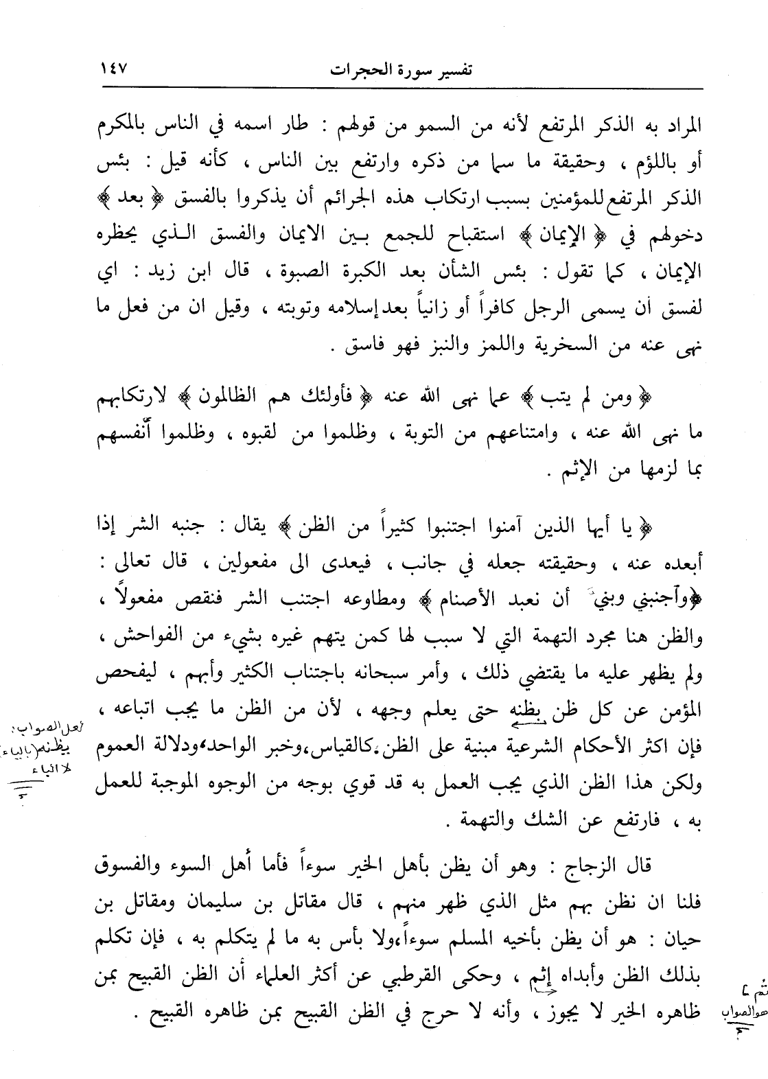 (يا أيها الذين آمنوا اجتنبوا كثيراً من الظن) يقال: جنبه الشر إذا أبعده عنه، وحقيقته جعله في جانب، فيعدى إلى مفعولين، قال تعالى: (وَاجْنُبْنِي وَبَنِيَّ أَنْ نَعْبُدَ الْأَصْنَامَ) ومطاوعه اجتنب الشر فنقص مفعولاً، والظن هنا مجرد التهمة التي لا سبب لها كمن يتهم غيره بشيء من الفواحش، ولم يظهر عليه ما يقتضي ذلك، وأمر سبحانه باجتناب الكثير وأبهم، ليفحص المؤمن عن كل ظن [يظنه] حتى يعلم وجهه، لأن من الظن ما يجب اتباعه، فإن أكثر الأحكام الشرعية مبنية على الظن: كالقياس، وخبر الواحد، ودلالة العموم ولكن هذا الظن الذي يجب العمل به قد قوي بوجه من الوجوه الموجبة للعمل به، فارتفع عن الشك والتهمة.