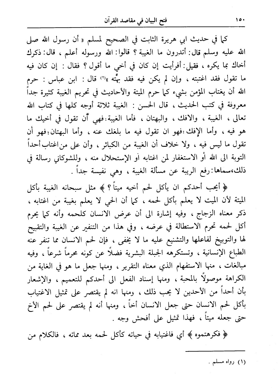 كما في حديث أبي هريرة الثابت في الصحيح لمسلم " أن رسول الله صلى الله عليه وسلم قال: أتدرون ما الغيبة؟ قالوا: الله ورسوله أعلم، قال: ذكرك أخاك بما يكره، فقيل: أفرأيت إن كان في أخي ما أقول؟ فقال: إن كان فيه ما تقول فقد اغتبته، وإن لم يكن فيه فقد بهَّته " (¬1) قال: ابن عباس: حرم الله أن يغتاب المؤمن بشيء كما حرم الميتة والأحاديث في تحريم الغيبة كثيرة جداً معروفة في كتب الحديث، قال الحسن: الغيبة ثلاثة أوجه كلها في كتاب الله تعالى، الغيبة، والإفك، والبهتان، فأما الغيبة: فهي أن تقول في أخيك ما هو فيه، وأما الإفك: فهو أن تقول فيه ما بلغك عنه، وأما البهتان: فهو أن تقول ما ليس فيه، ولا خلاف أن الغيبة من الكبائر، وأن على من اغتاب أحداً التوبة إلى الله أو الاستغفار لمن اغتابه أو الإستحلال منه، وللشوكاني رسالة في ذلك، سماها: رفع الريبة عن مسألة الغيبة، وهي نفيسة جداً.