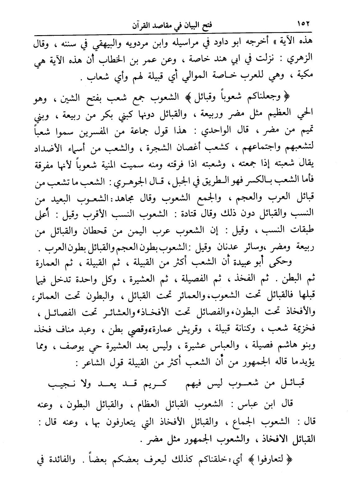 قال ابن عباس: الشعوب القبائل العظام، والقبائل البطون، وعنه قال: الشعوب الجماع، والقبائل الأفخاذ التي يتعارفون بها، وعنه قال: القبائل الأفخاذ، والشعوب الجمهور مثل مضر.